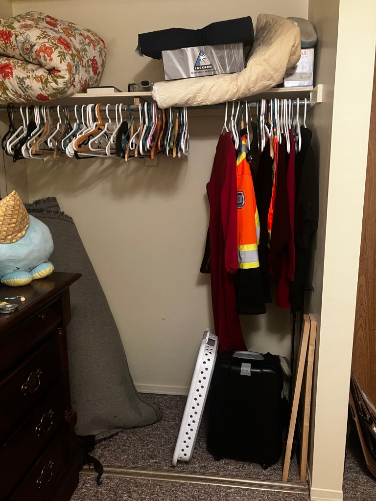 Basically everything is packed up in my bedroom, aside from essentials. My tiny carry-on suitcase and my folding laundry hamper, the rug. Most of the stuff on the top shelf is the homeowner’s, except my ice skates (I actually brought those to Thunder Bay with me last time, then changed my mind and brought them back. Fool of a Took!).