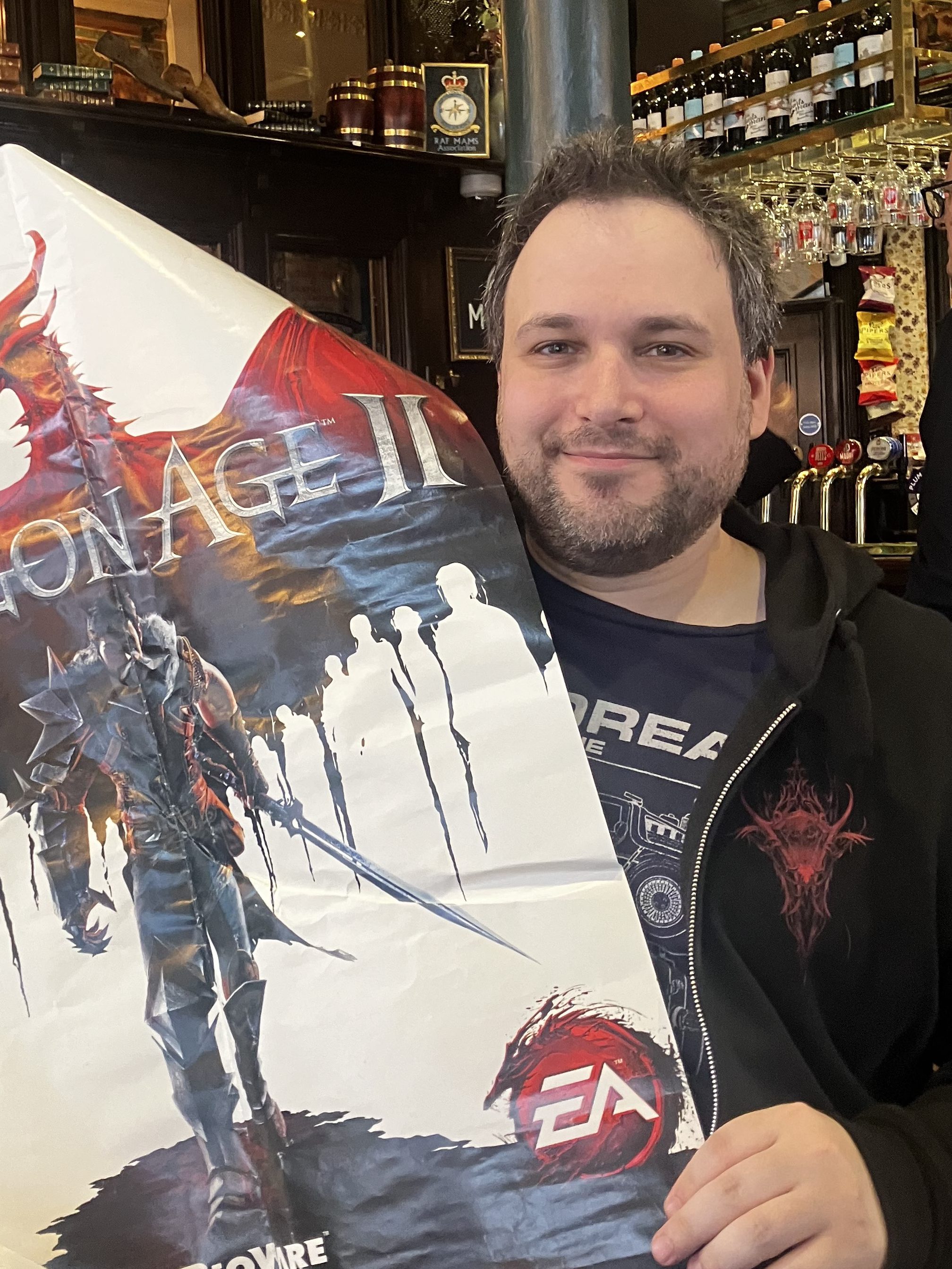 I gifted Damocles the above poster because that’s how we met; he had minted a new Dragon Age Discord server and was popping into random Dragon Age streams to invite people. At the time I believe I was newly single, so I had voids in my social calendar to fill, and both of us are quite gregarious, so we just talked a lot. Dragon Age 2 is his favourite, in a small portion because it’s the most contentious of the games. Then we chatted in the pub for an hour or two before I was obviously nodding off in my seat and they decided they should haul me home.