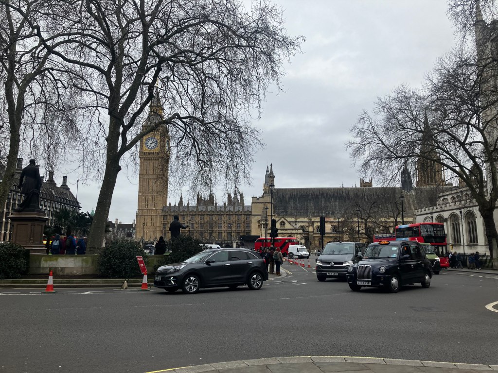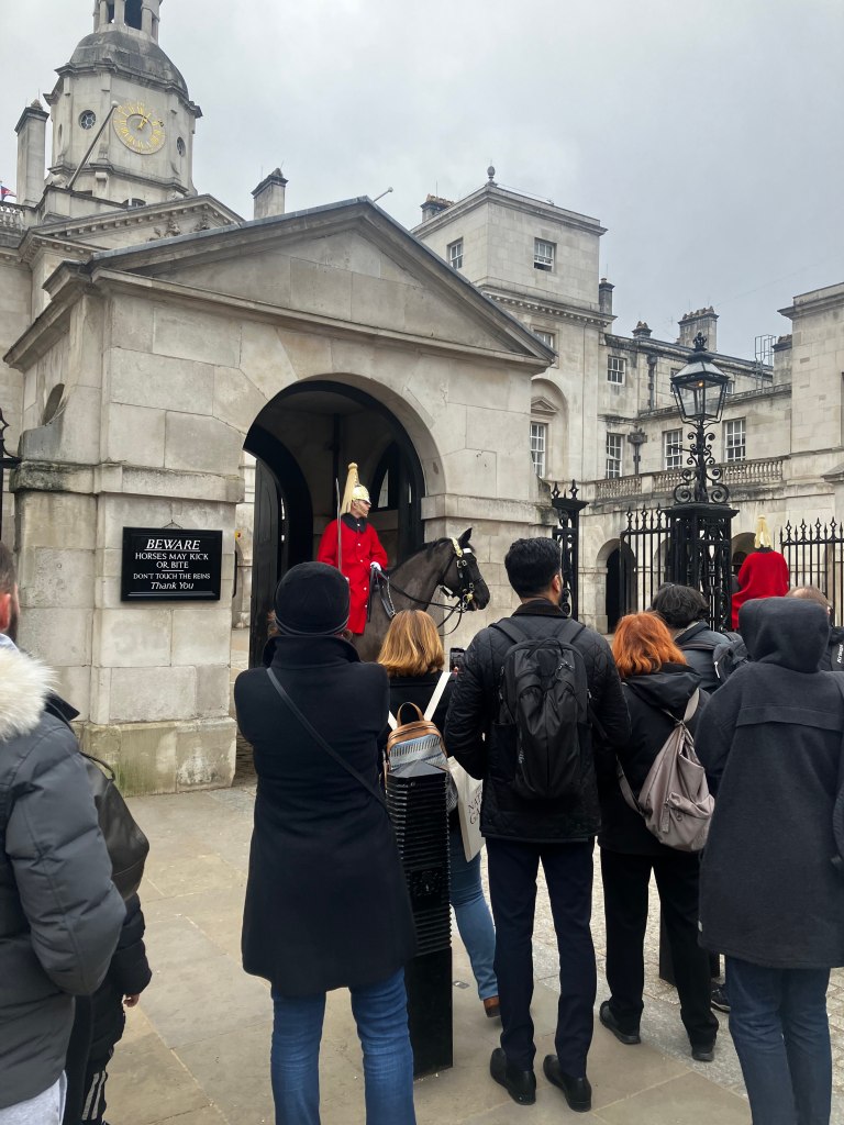Onwards we went, down Parliament Street. There was a place with some redcoats on horseback and a good amount of tourists standing behind some bollards. As we approached, I suggested we should go behind the bollards with the tourists, but Rich declined until a guard waved him down and told him to [Rich: well you see when a man with a gun tells you to do something you bloody well do it, especially since guns are so rarely seen in the UK]. So we stood and watched the horseguard change for a minute.