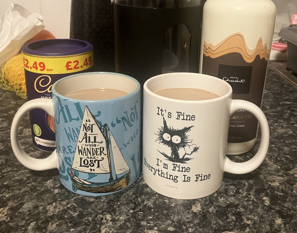 Now the dilemma. Do I sleep, knowing I’m messing myself up for bedtime but being too exhausted to function, or do I force myself to stay awake? I split the difference and had an hour nap on the couch. When I woke up, Rich ran to the chicken shop around the corner and got us some fried chicken and fries (chips). We made some hot chocolate with salted caramel liquor, in the two mugs Rich bought specifically for my visit, and watched Sherlock Holmes again. Then I fell asleep for ten hours.