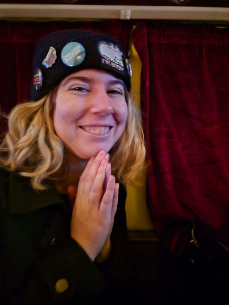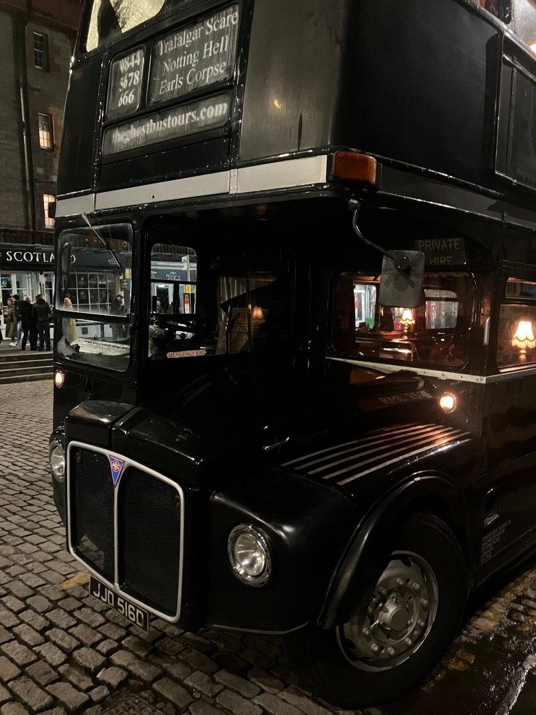 Ah, it was glorious though. The tricked-out bus was amazing; little lamps with tasseled shades, velvet curtains, and there were a few screens around. It became quickly apparent why; the announcer is shown on the screens, but they also used it to superimpose ‘ghosts’ over of him, supposedly haunting the bus. He was a riot; running around the bus with bombastic gestures and announcements, startling inattentive guests, leering directly into the security cameras for full effect! Whatever they pay him, it isn’t enough, because he gave 110% to the role!