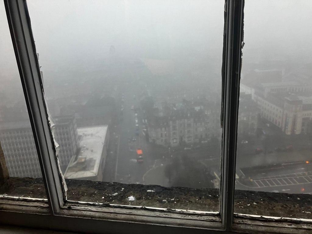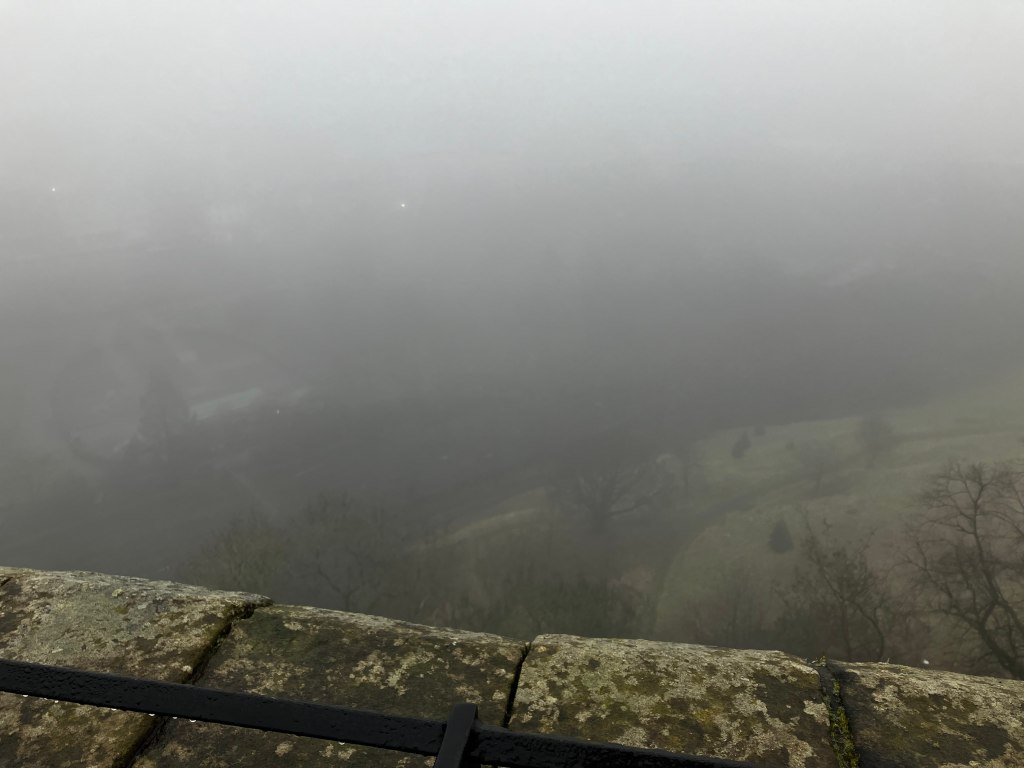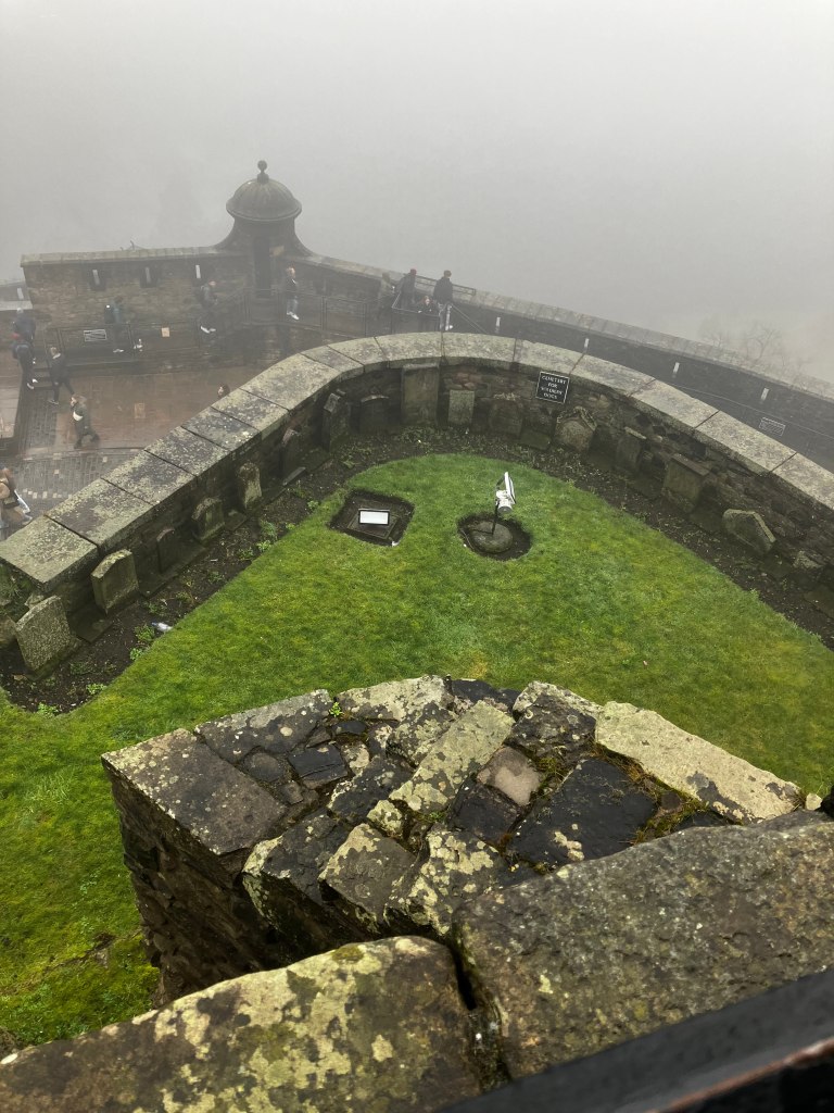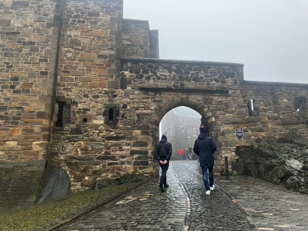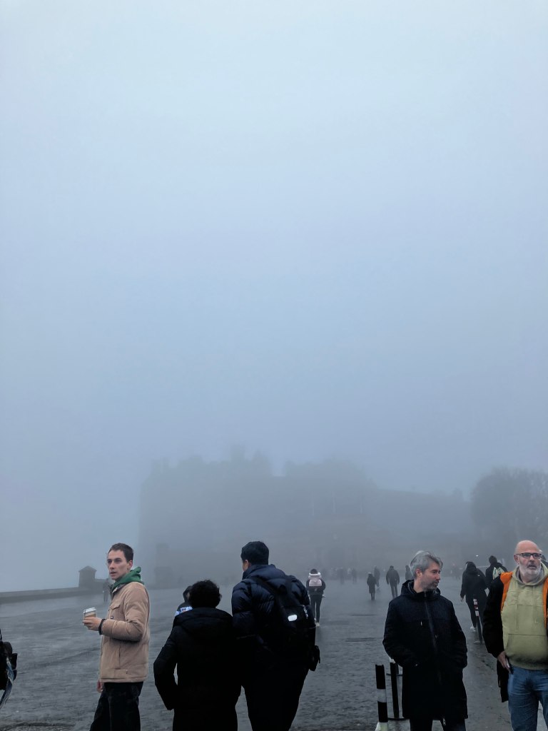 We walk literally five minutes up the road to Edinburgh Castle. It’s the picture perfect castle, perched on a rocky cliff high atop the city, accessible by only a single road. Unfortunately, magically, we picked the only day thus far that it has been foggy to go.