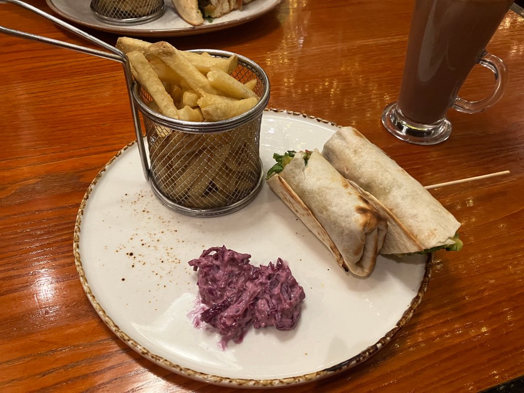 After we were done touring the castle, we wandered back down the road in search of lunch. Across the road from the hostel is a restaurant called “The Filling Station” that promises American food, which seemed like a good idea – not that I miss it, but it was nice to not have to translate a menu. Although their food was good, it was most certainly not in the same form as it would be served in North America.