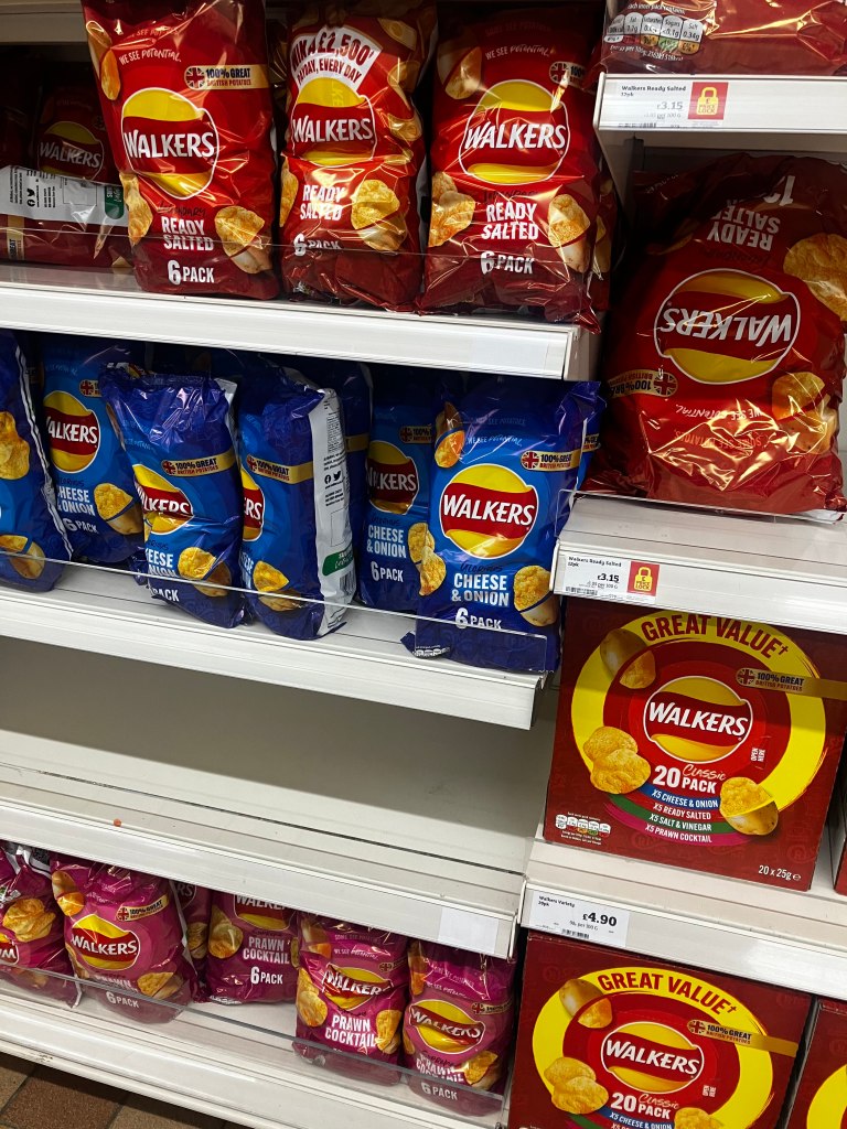 Over the weekend I went to buy chips, or ‘crisps’, for the first time since I got to the UK. They don’t have Lays, they have ‘Walkers’, which look to be the same thing. Doritos “Cool Original” instead of Cool Nacho. The texture of the chip is different as well. Well, it says corn chip, but I couldn’t find normal Doritos. Possibly due to the fact it’s a small store instead of a larger supermarket. I also bought a small bag of self-raising flour to use up some brown bananas in banana bread. The tiny size of everything here continues to boggle my mind.