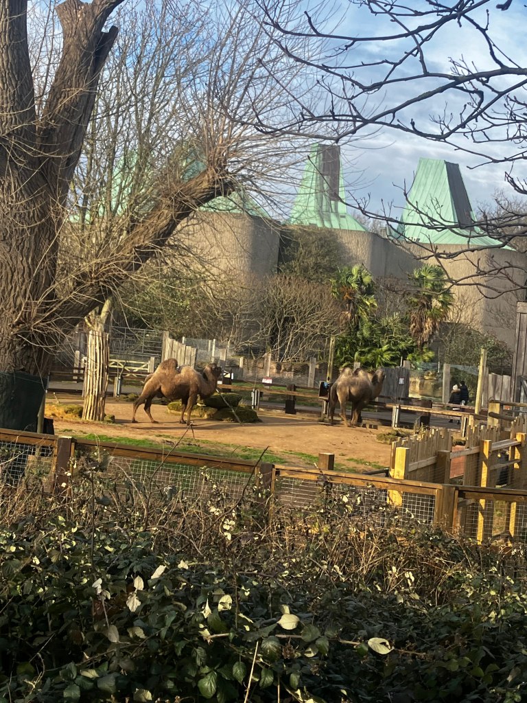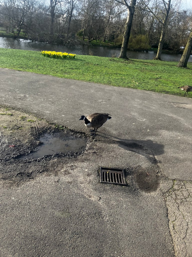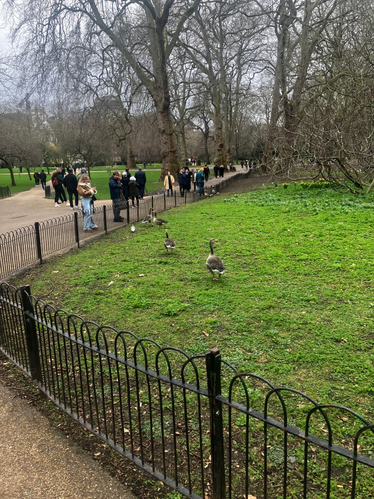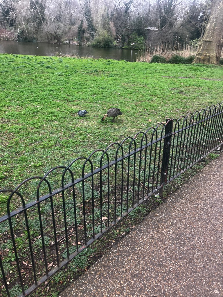 We walked across Regent’s Park next. We crossed Clarence Bridge into the park, and walked around to Queen Mary’s gardens. I presume it’s a rose garden – even with the barest hint of green on the bare branches, the whole place still reeks of roses. I was surprised to find a Canadian goose hanging around the place, but of course the British kidnapped some to bring back to their island of rain and misery. And good luck to them – they’re like weeds, except violent. There’s a reason someone called them ‘cobra chickens’ (the other reason being he was not fluent in English and didn’t know their name). We cut across to “the Broad Walk” and went up it to the north side of the sports fields. If you follow the path there, you can easily see into the London zoo, for some reason.