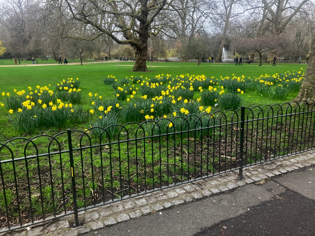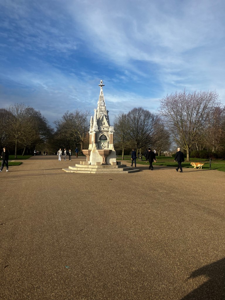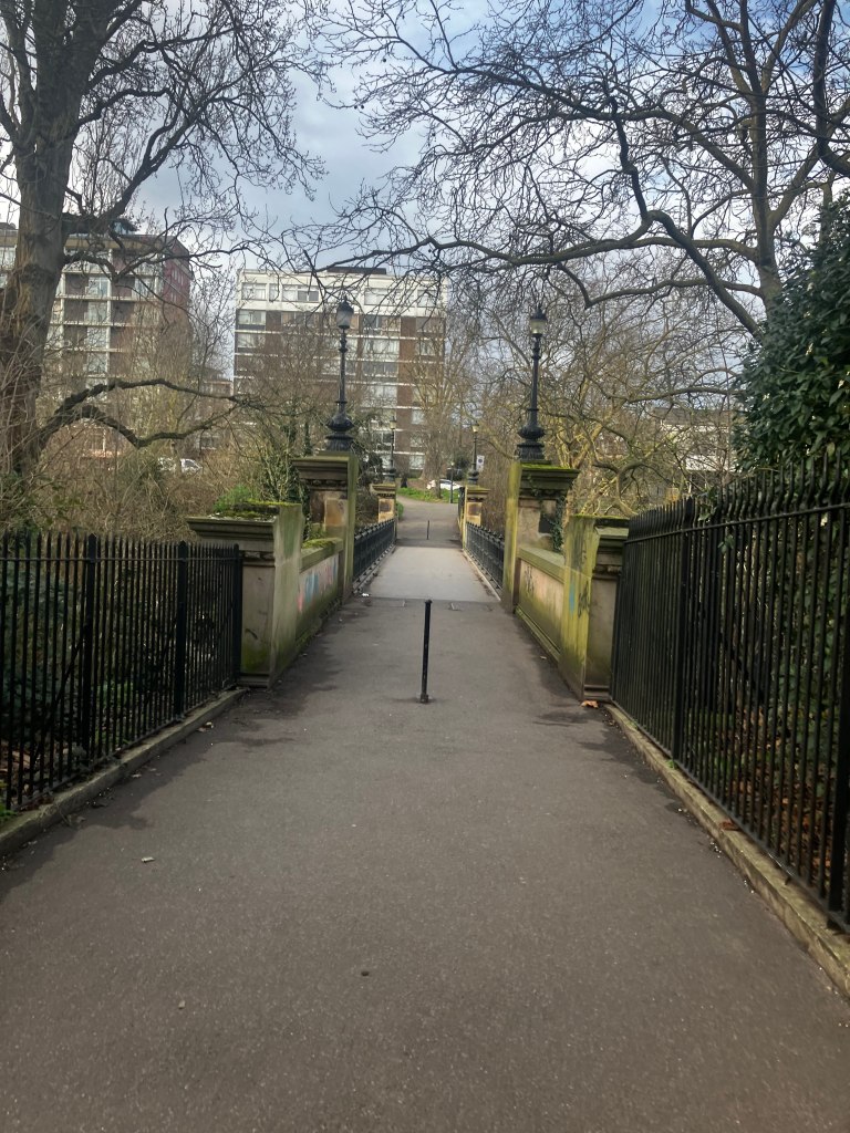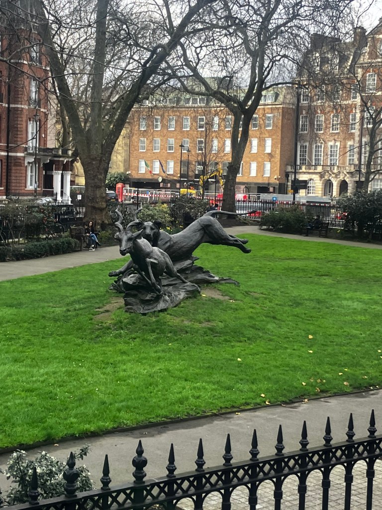 We walked across Regent’s Park next. We crossed Clarence Bridge into the park, and walked around to Queen Mary’s gardens. I presume it’s a rose garden – even with the barest hint of green on the bare branches, the whole place still reeks of roses. I was surprised to find a Canadian goose hanging around the place, but of course the British kidnapped some to bring back to their island of rain and misery. And good luck to them – they’re like weeds, except violent. There’s a reason someone called them ‘cobra chickens’ (the other reason being he was not fluent in English and didn’t know their name). We cut across to “the Broad Walk” and went up it to the north side of the sports fields. If you follow the path there, you can easily see into the London zoo, for some reason.