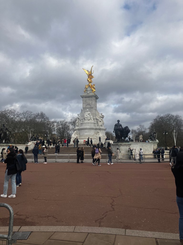 We started at Victoria Station at noon and walked over to Buckingham Palace. We walked past, I believe, St James Park, which had all kinds of waterfowl crowded around it. The tulips were in full bloom and the sun was shining, so it was quite lovely. Damocles complained that I didn’t bring the snow with me – he’s always been enamored with the perfect snow day. He wanted to get a picture of me in front of the guards, because it’s cheeky, I suppose.