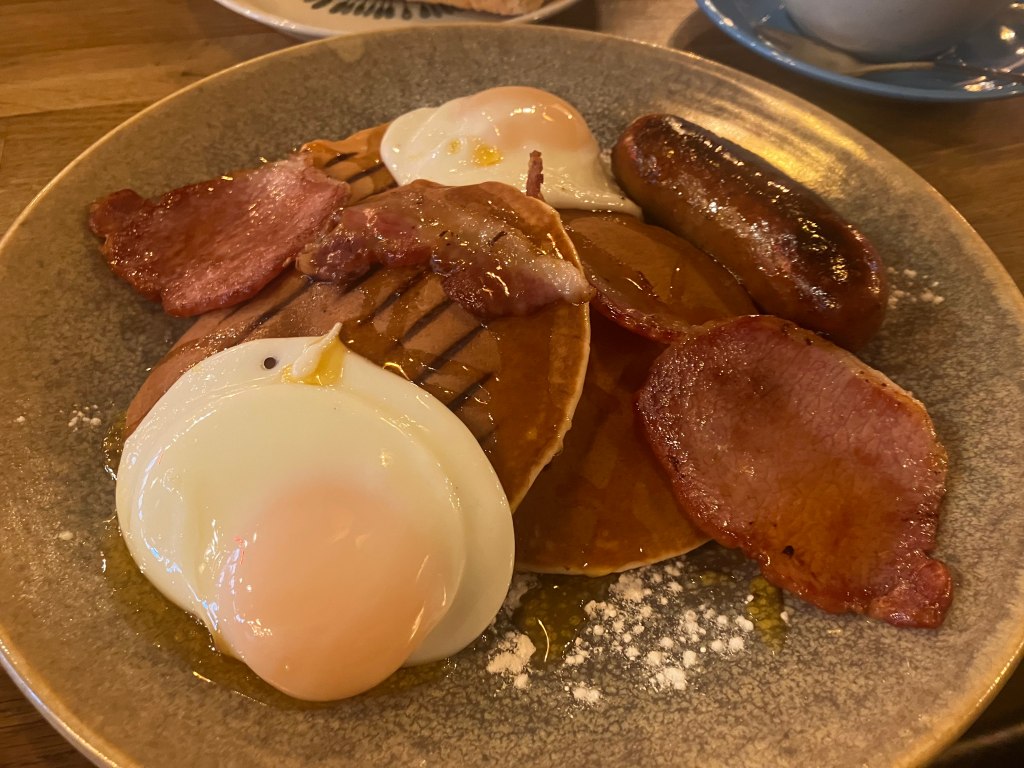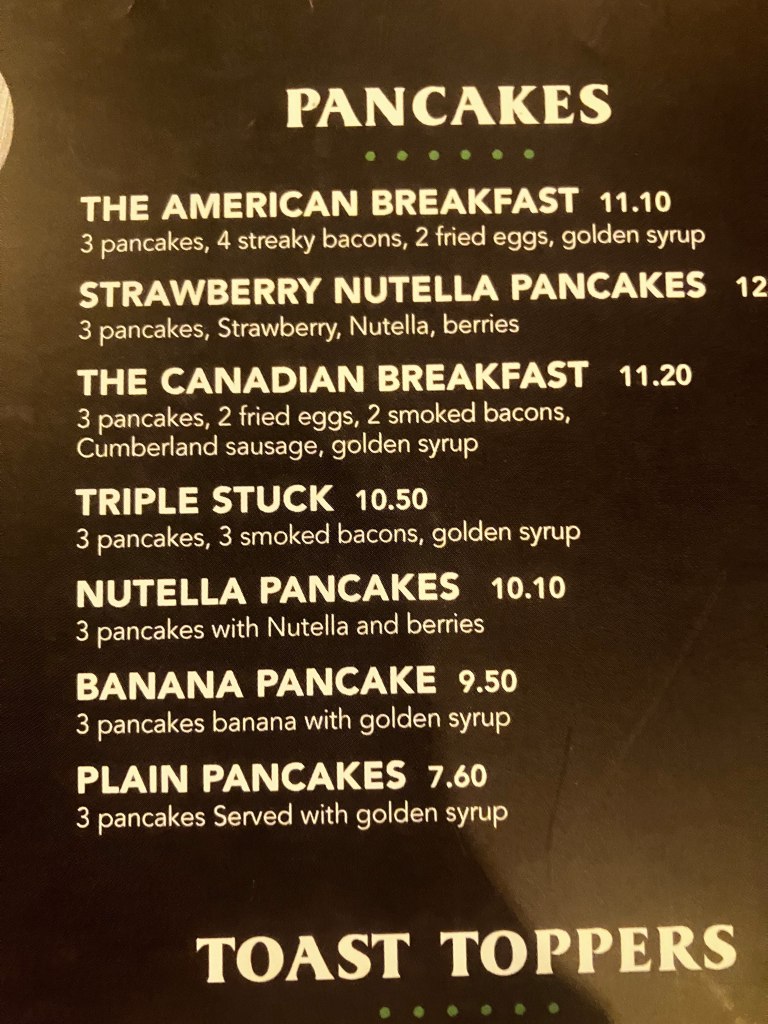 In the morning, I got up before him, which isn’t unusual cuz he’s a total night owl. I found a nice breakfast place down the road, but before I could sneak out he got up and insisted on accompanying me. Since the characteristic British rain had finally showed up, he also insisted on holding an umbrella over my head the entire walk. The restaurant had a ‘Canadian Breakfast’, which of course I had to try. I assume it’s “Canadian” because the ‘smoked bacon’ is vaguely like peameal bacon? It isn’t proper peameal/ ‘Canadian’ bacon, and the syrup wasn’t even real maple syrup, but it was still a good breakfast. They also put grill lines on the pancakes for some reason.