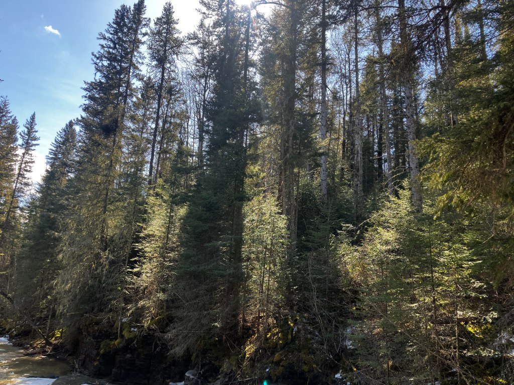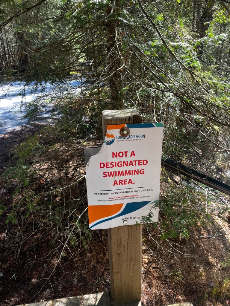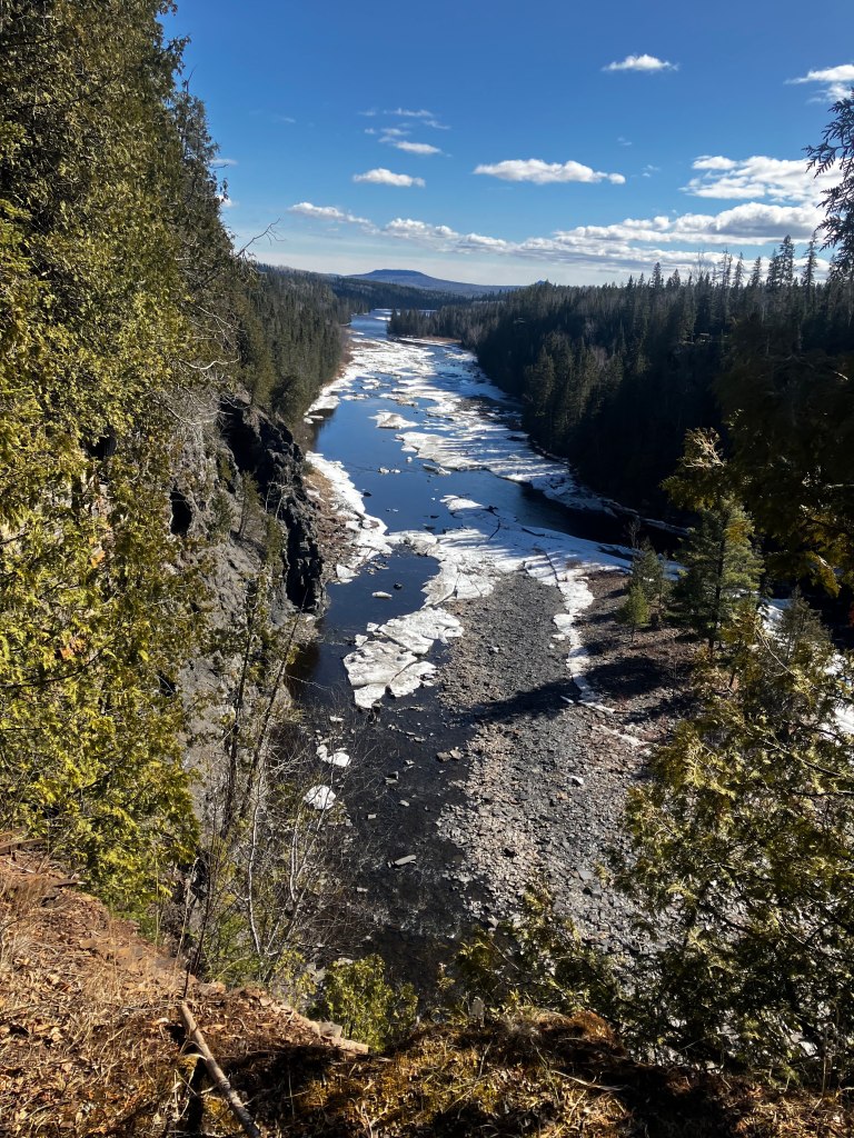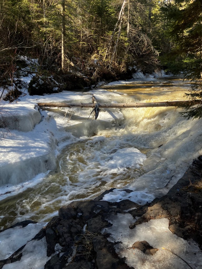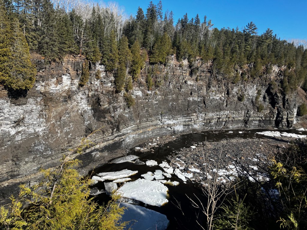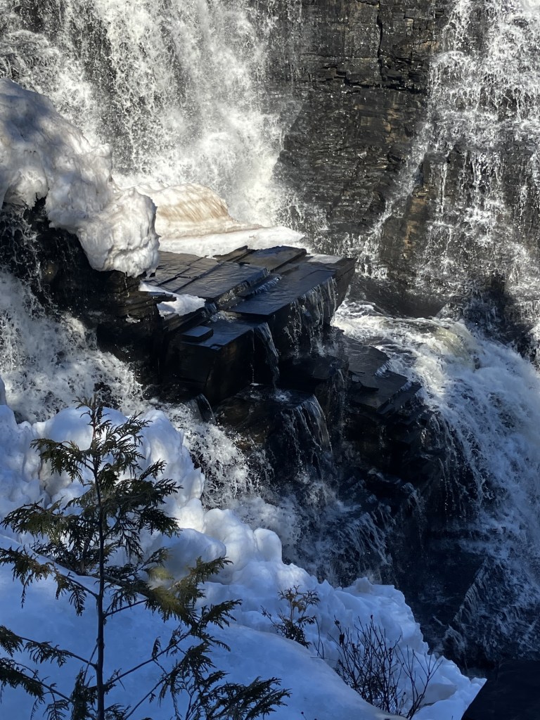 Our first stop was Cedar Falls. It’s a little bit past Kakabeka, about a kilometer into the woods, not steep but not level either. There were frozen patches where the sun couldn’t reach through the trees. There’s seems to be some good fishing there, and when the river thaws rainbow trout jump up the falls, so we will be going back to see that!