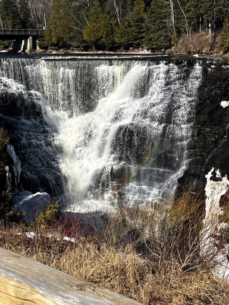 We spent over an hour out there. Then we headed back to Kakabeka – Hanuman had never been! It was nice to visit again, actually. With the water flow reduced by the frozen river, you can see the rocks of the falls, and in the pool at the bottom. I’ll do some side by sides for comparison.