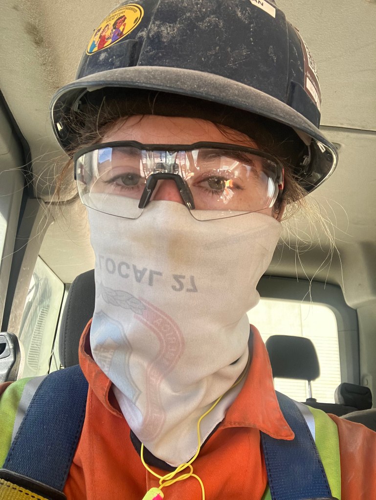 It was bad, and since I was at the bottom of the chain, I got the worst of it. I’ve taken to wearing this thing that someone gave me at a meeting. It’s long enough to cover my entire face and neck, but I fold it in half. I tucked it around the collar of my coveralls, wrapped it around my hair bun and pinned it into the back of my hard hat before pulling it up under my glasses, covering my mouth and nose. This way, it stops any dust from going in my mouth and nose, or down into my coveralls.