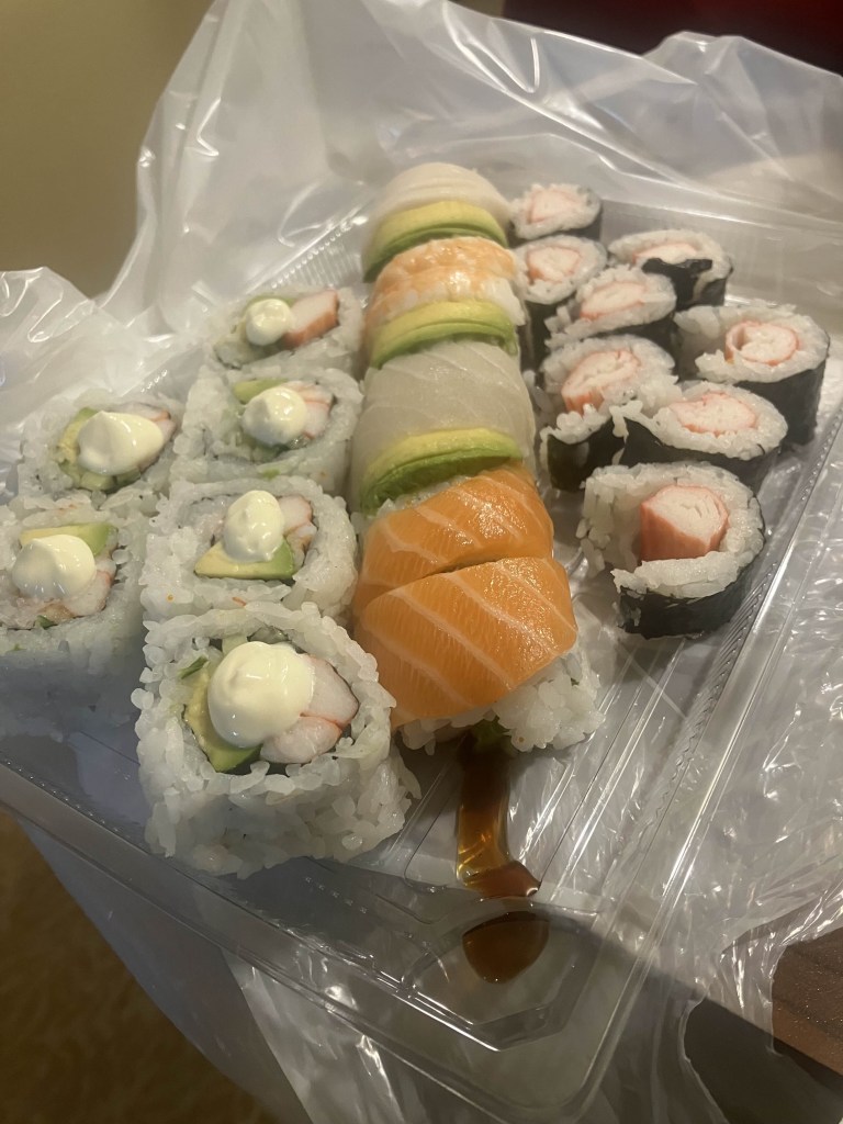 Once back at the hotel, I showered and then changed into pajamas. Oh shoot – Dinner! I hadn’t had a chance to buy food – I brought leftover nachos for lunch today. Eh, I can’t be bothered to go out again. I ordered sushi, a little bit extra for work, and settled into the room that would be home for 3 weeks.