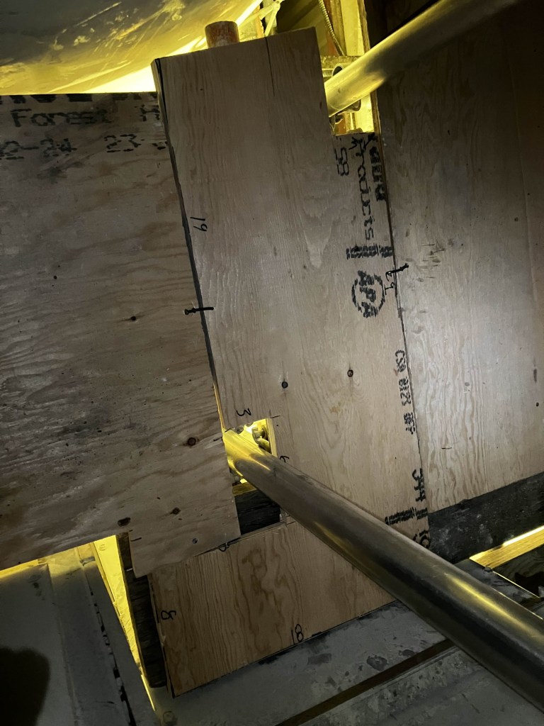 Eventually I run out of places to plywood and wander down to the main floor. These gloves are far, far too big for me. I can’t use my hammer properly with them on, as the hammer slips in my grasp. I’ve just been taking my right glove off to use my hammer. Mikey suggested I try to keep my wrist rigid when I swing, and I noticed that I can feel an underdeveloped muscle in my upper arm engage when I do. So I grab a pile of cleats and my secret stash of nails and find a place to practice. They use plywood cleats here instead of 2×6, which is harder to nail. One, because the two layers of plywood slip and slide each time you swing, but also because it means you have to hammer them twice, to break through the virgin wood of the second layer. It’s a harder workout.