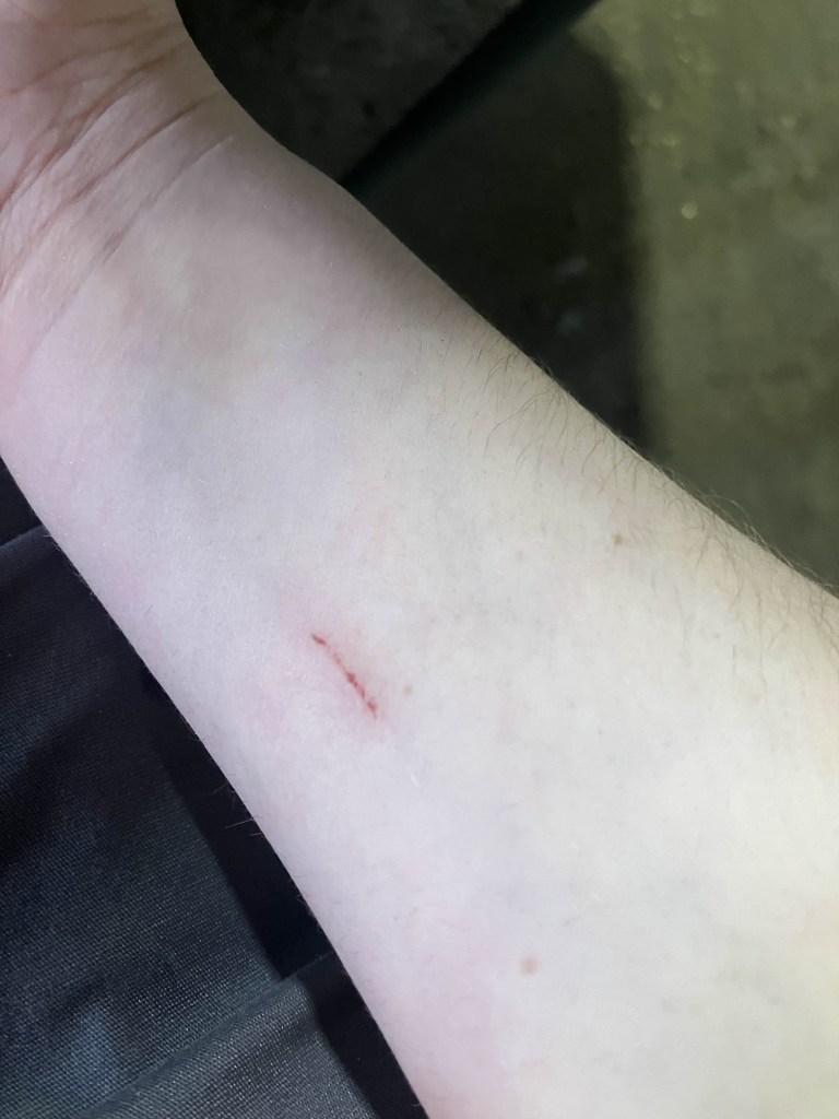 Shortly before first break, I cut myself with the nail puller on my hammer. It’s easier to do than you think. We use our hammers for so many things – I specifically got this hammer because it has a longer handle, because scaffolders often use their hammer like a climbing axe. Or to reach and knock over a wedge just beyond my fingertips. We also use the nail puller to mark cuts by etching it into the surface, or to cut a piece of wood that’s just hanging on by a thread. Sometimes we even split planks with the end like a proper axe! So the end is sharp and often by my elbow, and with all the wriggling around tight corners I got myself with it. I asked at the lunchroom if I should put a bandaid on it, and everyone said no because then I’d have to file an incident report, so I didn’t.