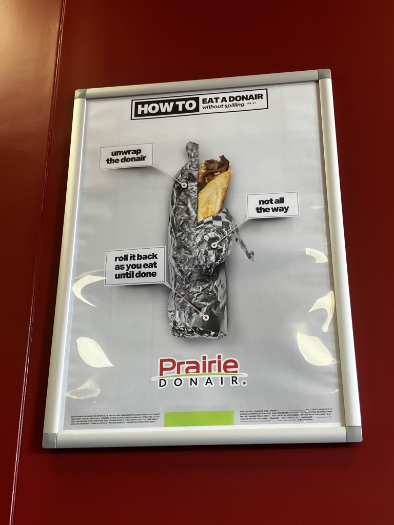 After work, I show Duff my secret shopping centre. He approves. I was intending to go to Popeyes for dinner, but he points to a place across the way – Prairie Donair.