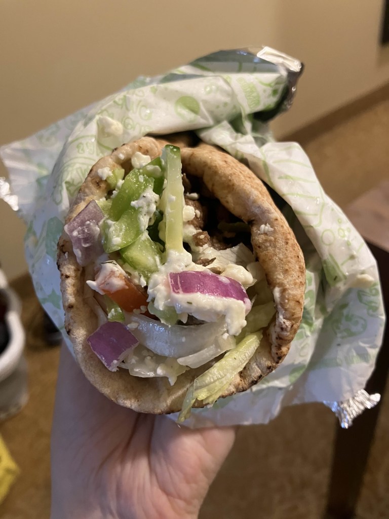 Duff smiled while I tore around the store like a kid in a candy shop, clapping my hands and excitedly commenting on everything. Apparently they are so popular in Winnipeg there is more of them than there are Timmies. I had half a hope they might have rappie pie, but they do not. I ended up ordering plain gyros – I actually don’t really like Donairs.