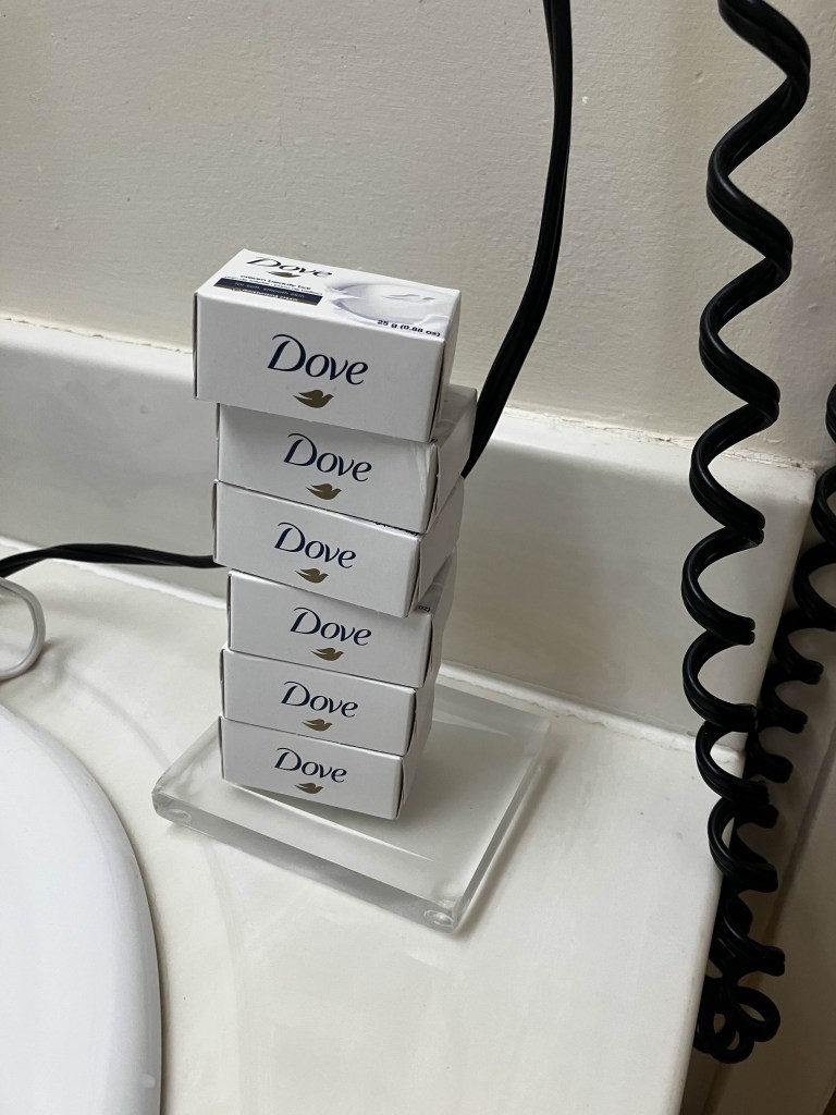 The cleaning lady is strange. She doesn’t clean my room every day, which is fine – I don’t expect or need her to. But regardless of the fact I haven’t touched any of the free soaps because I brought me own, she keeps restocking them. So I’ve just been stacking them into a neat little pile for my own amusement. Maybe she has an overstock and is trying to get rid of them.