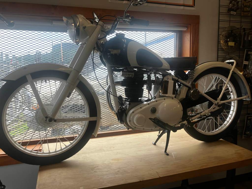 He took me down to the bike shop, finally. They have a bunch of nice old bikes there, one even from World War Two, with its little two-stroke engine and battery so small it could fit in the palm of my hand, painted army green. There was also a bike with the red and white “Support 81” and “Nomads of Ontario” on it. I wonder who originally owned that?