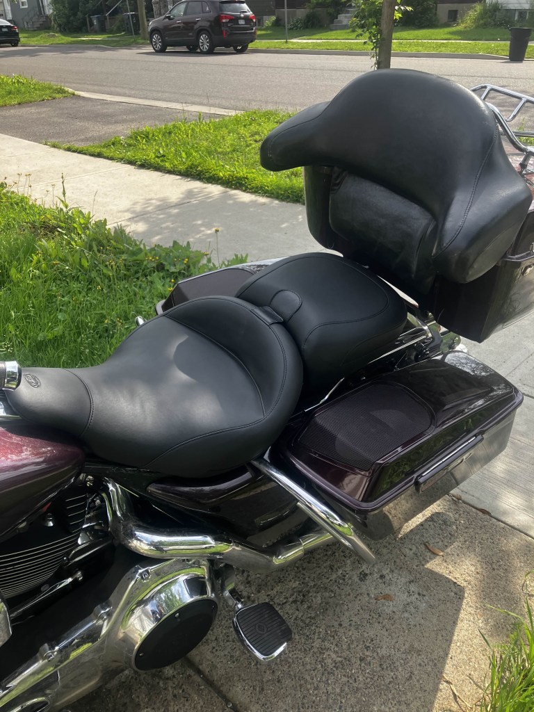 So, remember what I said earlier about the new seat being too easy to sit on? He took the tour-pak off the back of the bike to clean it and didn’t put it back on before the ride. I tend to lean back on it like a car seat, and when I suddenly didn’t have it behind me, I was lost. The biggest problem is that my helmet is quite large, and when I have to snuggle up to him for balance, I lurch forward when he twists the throttle and smack my head off his. For an in-town ride without the tour-pak, his spare half-shell is probably enough, and would have helped avoid knocking our heads together. Woops.