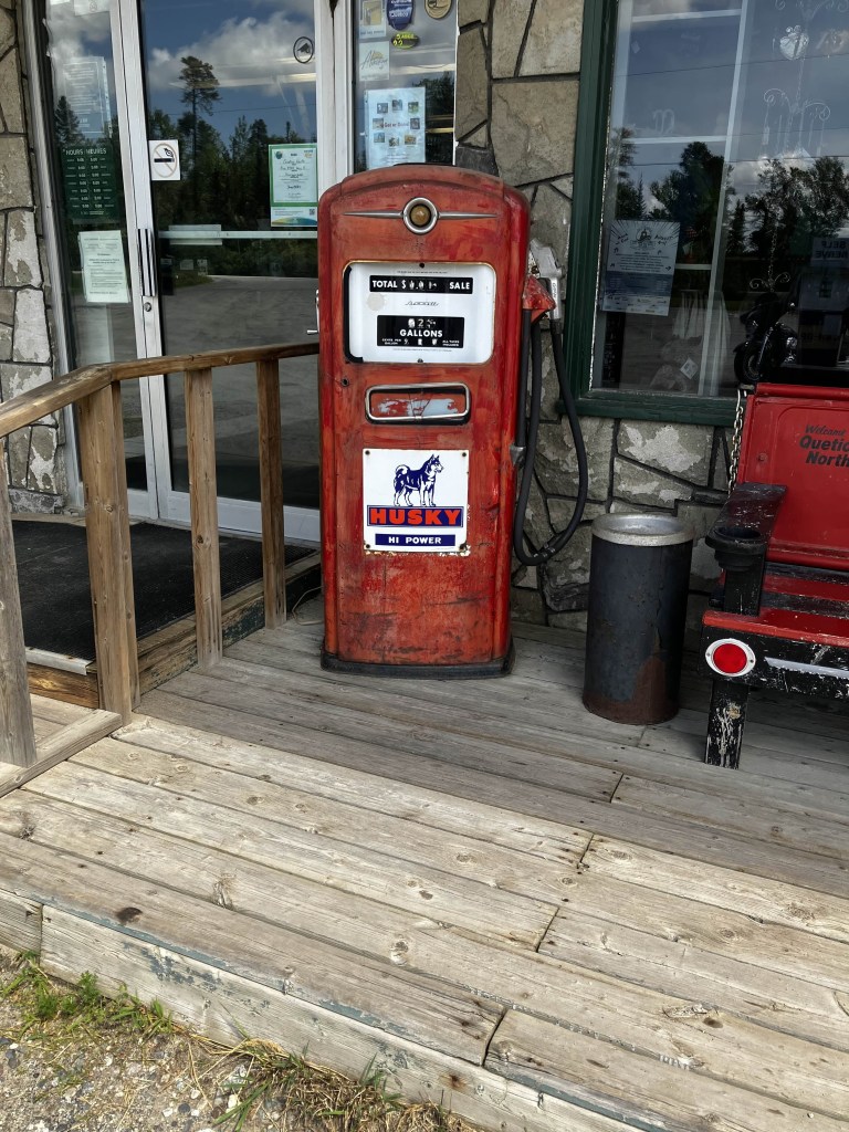He was a little cranky. Work had told him they wanted him back a day early, which had messed up his planned schedule. He had a massage appointment for Monday, which he was now debating if he could move to tomorrow after we got back. He developed some sort of loose plan to stop in English River for the night, instead of going up to Ear Falls. We stopped in Sioux Narrows for gas and someone’s car had stalled in front of the pump, so he just wriggled the bike up between the car and the pump and filled up anyway.