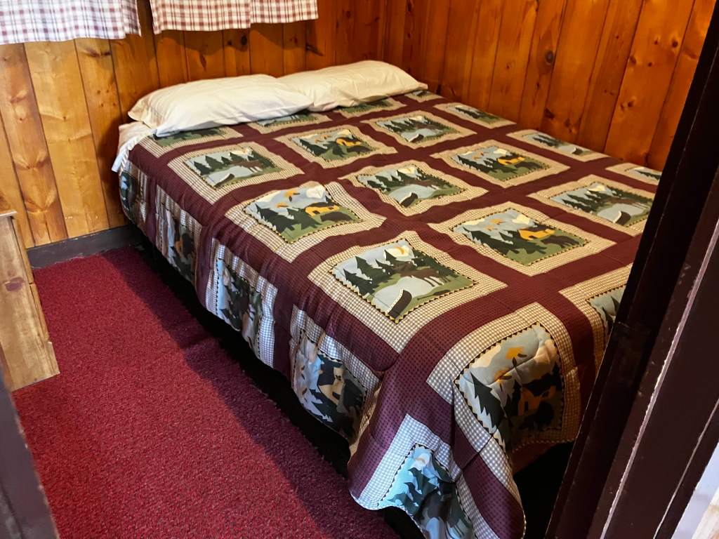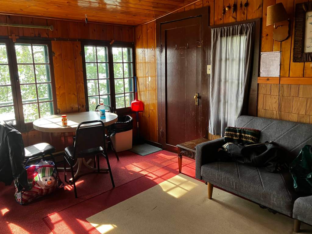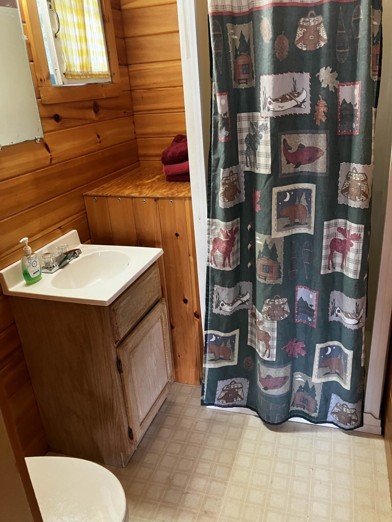 The cabin is small and quaint. The deck wraps around the front, with the porch and the windows facing the lake. The main room had a small kitchenette, a couch, a cot, and a table with three chairs. There is a TV over the sink. The bedroom is little more than a closet, just large enough to wedge a queen-sized bed in to. The bathroom is a closet as well. The fridge and the hot water tank needed to be turned on with the fuse panel.
