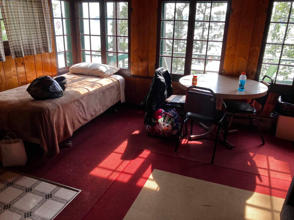 The “resort” was little more than a dirt road with a collection of cabins, wedged between the highway and the lake. That’s all we need, though. Our cabin was at the back, closest to the lake. Harder to get to with the bike, but more private.