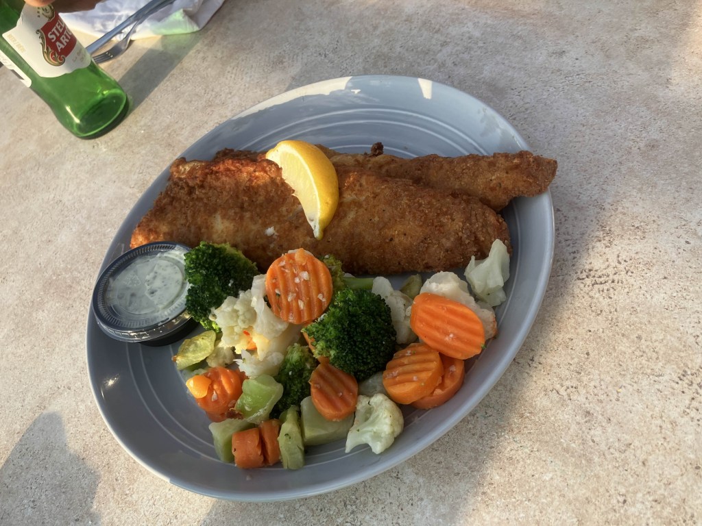 They have a new waitress who was very flustered and forgetful. The short-order cook eventually came out to ask what we wanted because she had gotten confused. I had a Kentucky Bluegrass, which was good if a tad sweet, and we shared the fried Walleye, which came with two pieces. It was very good – I’m unsure if I’ve had Walleye before.