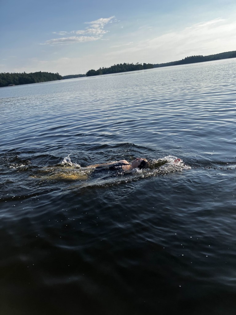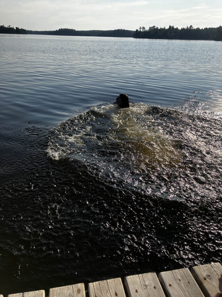 We lounged around the dock until dinner time. I appreciated the water socks for walking down to the dock, although I can’t swim with them on. I went swimming a few times – the water was cold once you jumped in, but warmed quickly. The Vagabond wasn’t much for swimming, although he jumped in a few times. No one’s ever taught him to swim, so he was surprised at my perfect dives and practicing the different strokes. I am very out of practice and tired quickly. I was also nervous, there wasn’t any flagging to indicate to passing boats that there was swimming in the area.