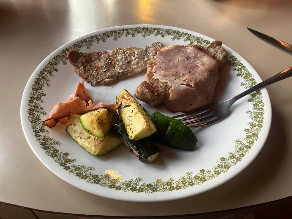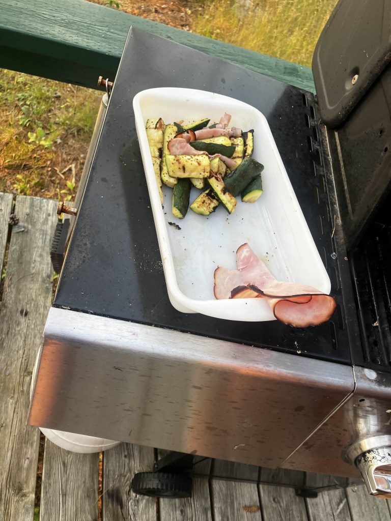 Later on, we went up the road to grab some more groceries. He decided on pork chops, black forest ham for some reason, and zucchini. They had beer and wine but no coolers at the store, and I didn’t feel like grabbing another bottle of whisky – at this point, anything we didn’t finish tonight would either have to be thrown out or packed up. As we exited the store and started packing everything back in the bike, he nudged me.