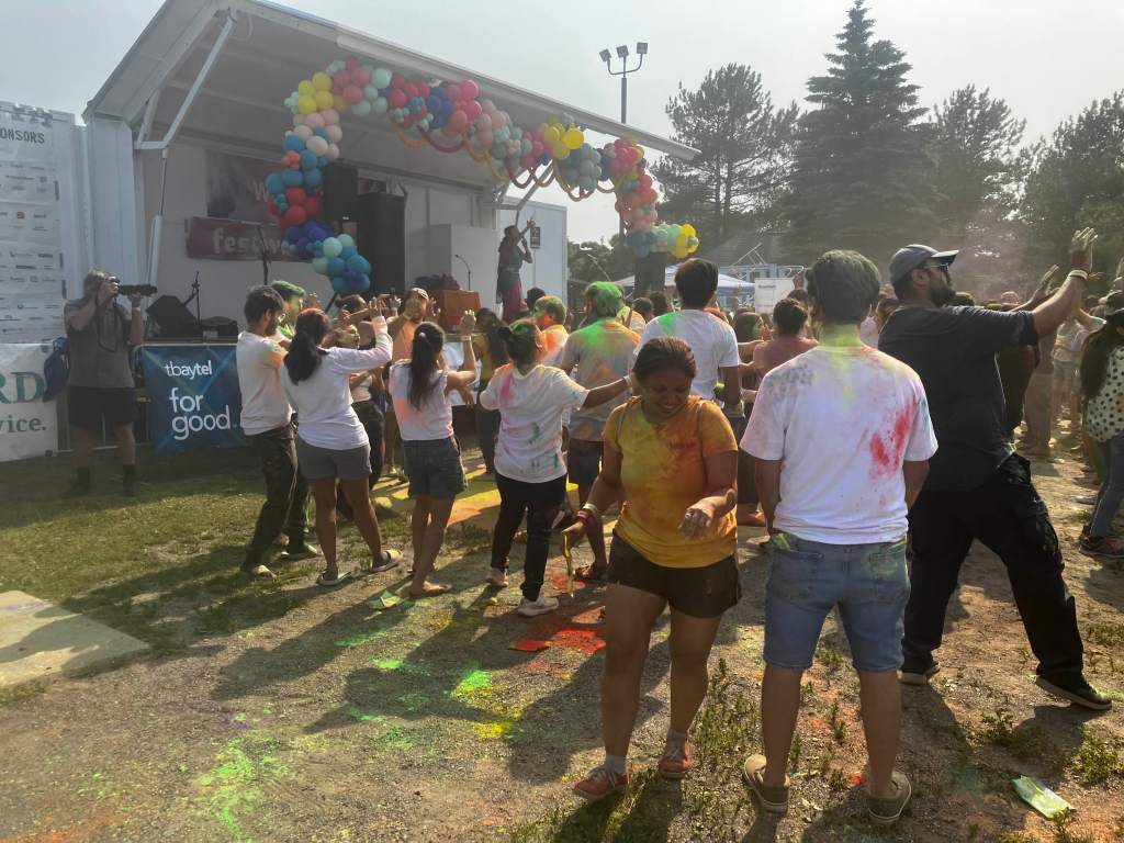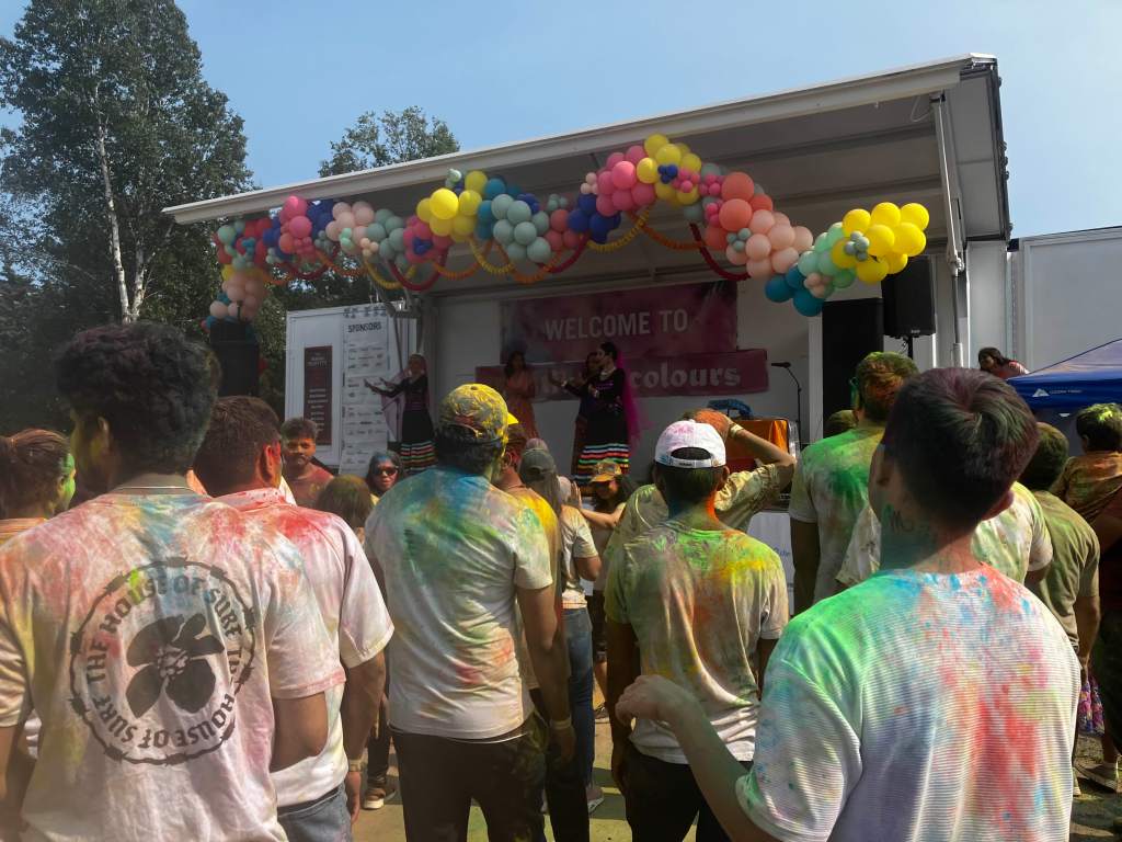 The sign-up says to wear clothes you don’t mind staining, just in case, so I wore work pants and a work shirt. I wandered down to the waterfront and there was a bit of a snafu about tickets. Finally I was given a wrist band and a little token to redeem for the “colours”, which is simply a packet of dyed cornstarch. They have a sort of fenced off mosh pit in front of the stage now.