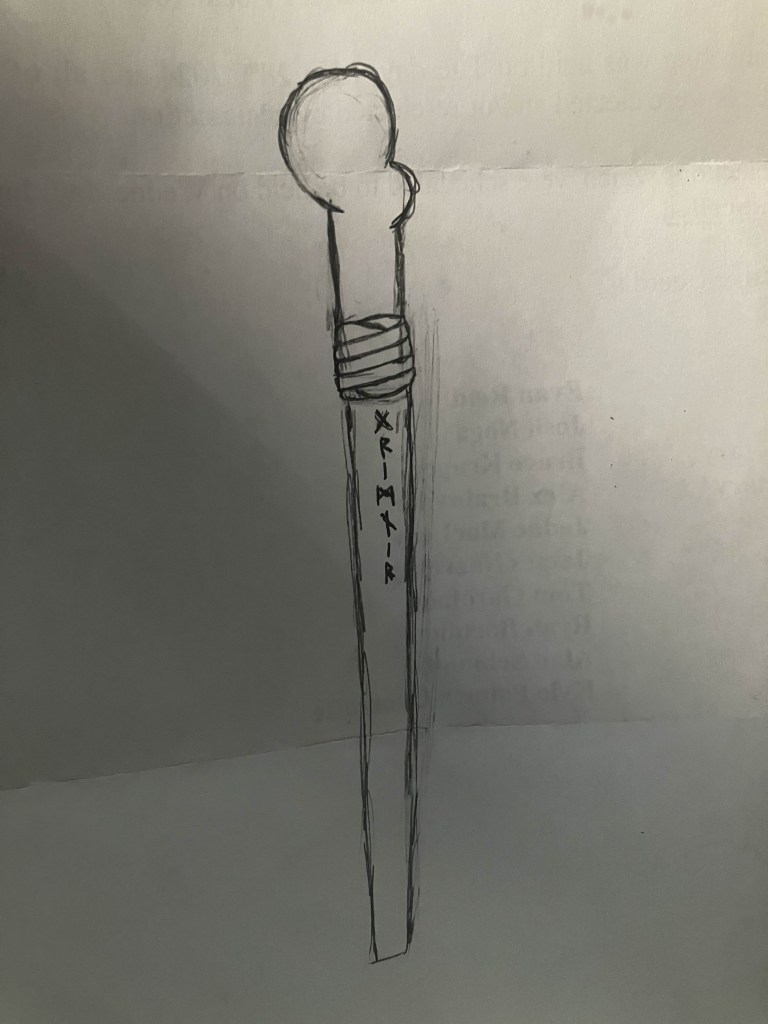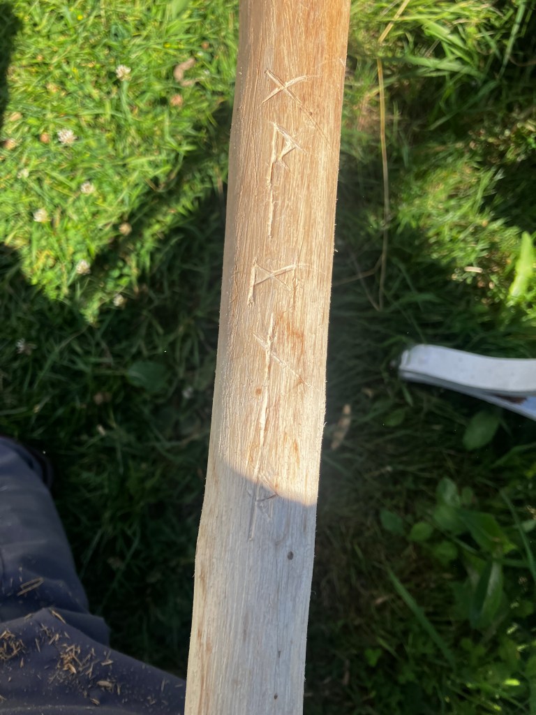 I know I wanted it to be roughly 6 feet tall, so he could lean on it like a wizard staff, and a leather cord for a grip. I also had the idea of carving some runes on it. In this instance, Grimnir – one of Odin’s epithet’s, meaning “masked” or “hooded”. It refers to Odin’s propensity to go amongst the human population in disguise. I chose it because me and the Vagabond loves masks, both literally and as metaphors.