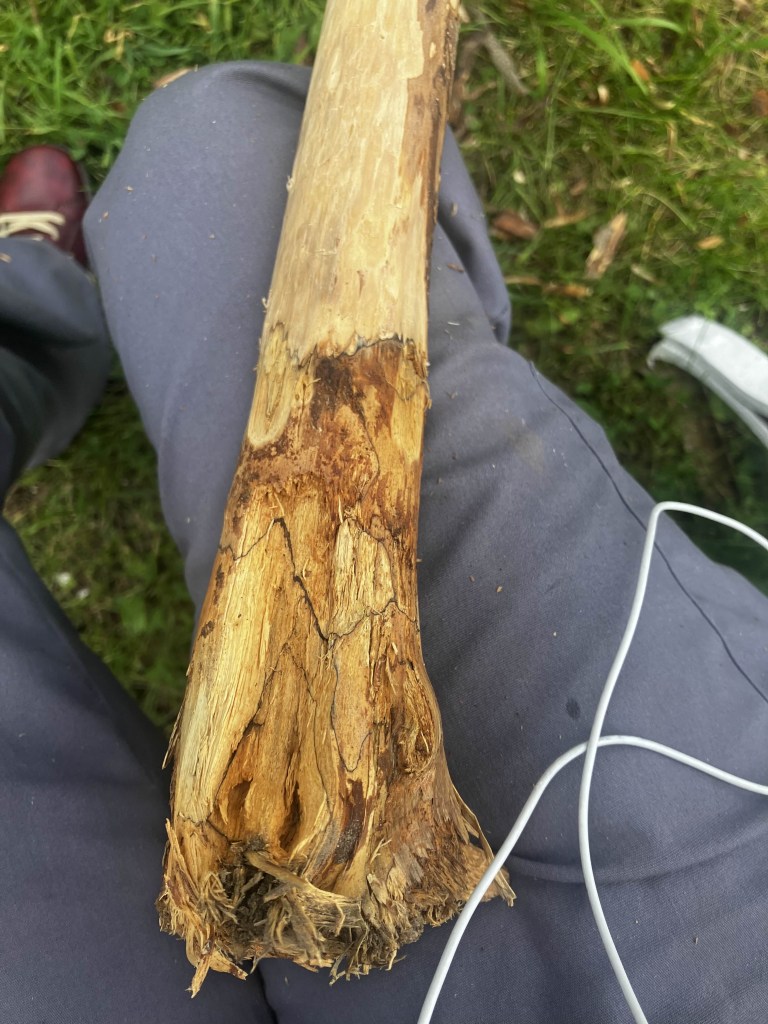 The top of the stick gave me pause and made me second guess having cut it down already. I was still unsure how to shape it, or what I should shape it to be. I decided to use the larger grit sandpaper to get rid of the sharp edges, but some of the wood was rotten from the water damage and chunks started falling off in my hands!