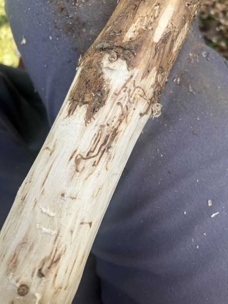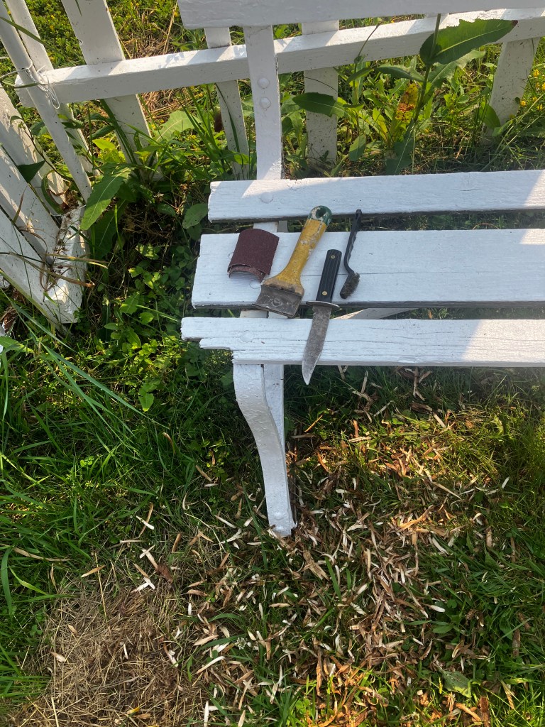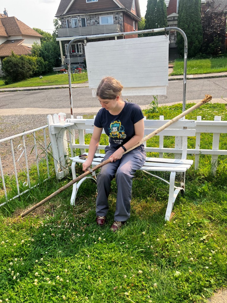 I grabbed my trusty utility knife, the case of new blades, a drink and my headphones, and sat down on the bench in the yard. The sun was a bit much, even in the late afternoon. The first foot was smooth and came off easily. Around the 2-3 foot mark, I started encountering knots, which were tricky to tackle with my little knife. I also kept finding worm tracks, and I was unsure if I should carve them off or try to fill them in.