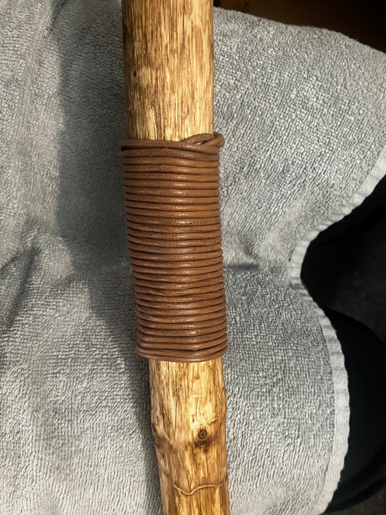 I had a length of leather cord for a handle. A walking stick doesn’t need a handle wrap, but I thought a proper wizard stave should have one. I let the cord soak in water for an hour – that way, when the leather dries and shrinks, it’s practically bonded to the stick.