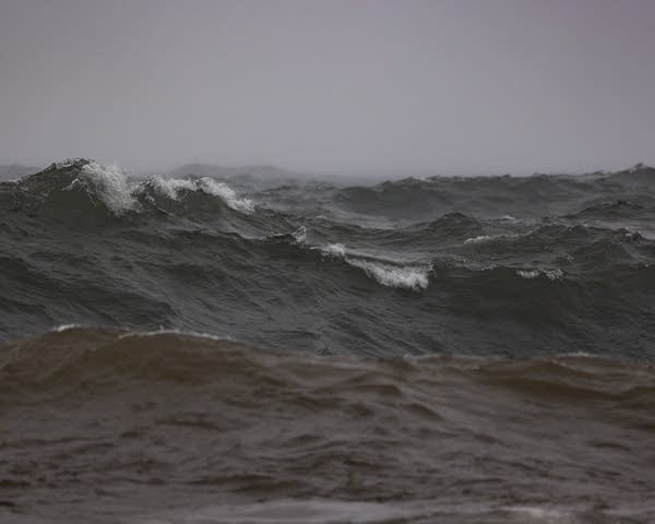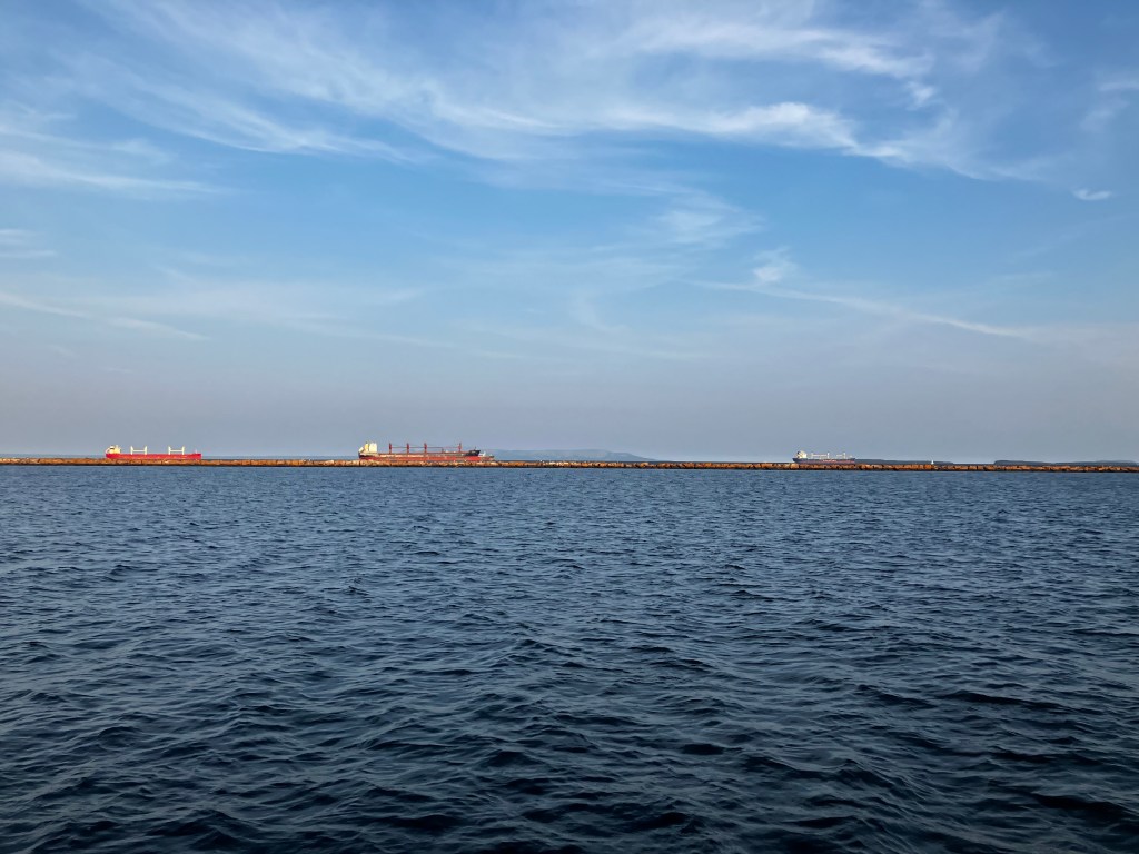 As we approached the edge of the breakwaters, you could literally see the line where lake became sea. The waves were 2-5 feet tall and some were whitecaps. As we plunged into the deep waves, some of them broke upon the bow and sprayed us with cold water! Chris brought the ship about and we went back into the breakwaters – some people wanted to change into water-proof clothing. They offered me some spares, but I’m used to being wet from work and the motorcycle. I did dig everything out of my pockets to toss into the cabin, just in case.