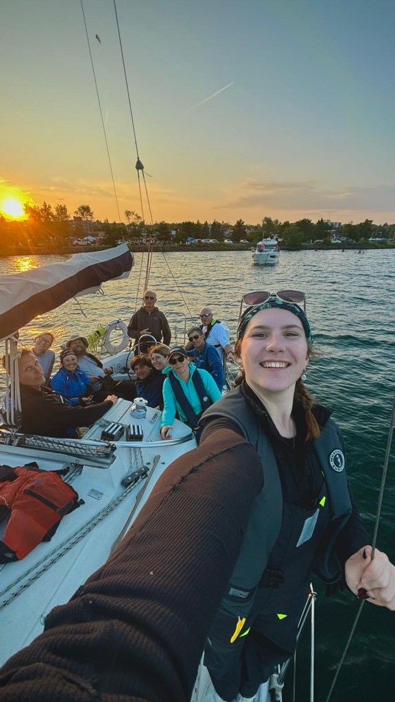 There was too many of us for me to tack and jibe today, so Marcus took control of the foredeck (IE everyone not in the pit). He set me and Gillian to assist in tacking and jibing by grabbing the corner of the jib and bringing it around the mast, so the people hauling on the ropes didn’t have to fight the wind so much.