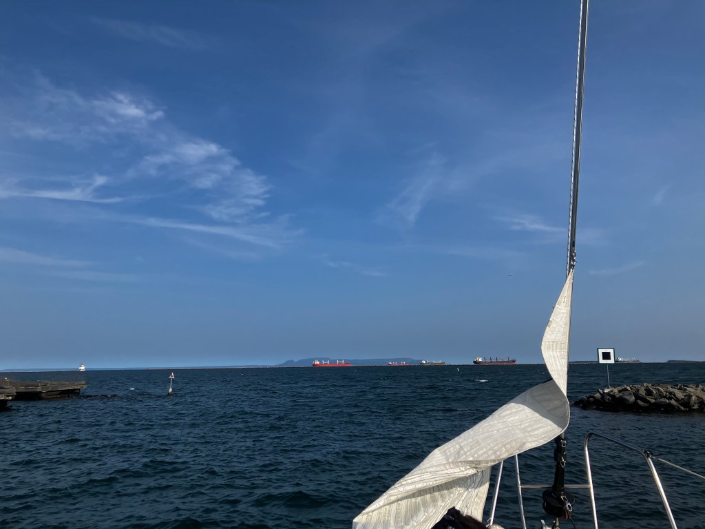 Everyone was recovered from the weekend’s festivities and bolstered by the strong wind, so there were lots of boats out. It was a paradoxically beautiful sunny day. There was 5 bulk carriers in the bay and 2 being loaded up at the elevators – Kevin said 2 were here to pick up potash.