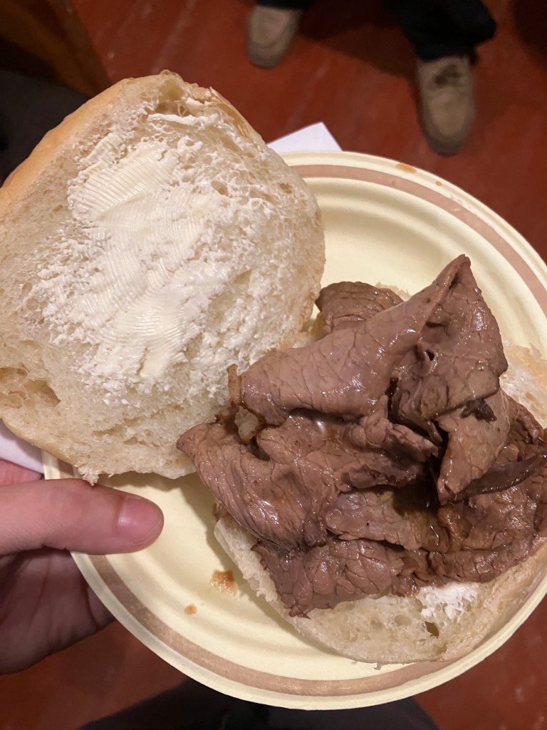 I had followed Kevin. He’s quickly figured out that I’m socially awkward/ anxious and I’ll just follow his lead, so he grabbed a bun, slapped some margarine on it, and ladled on some gravy and beef. I copied him.