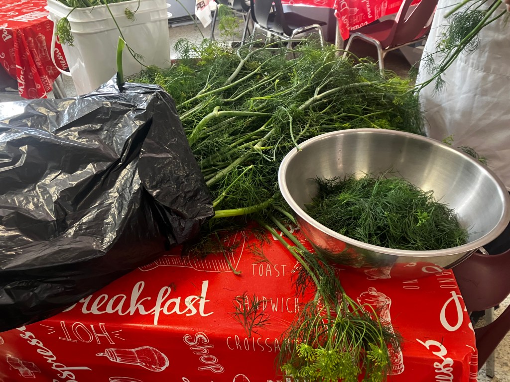 One of the Dew Drop employees came in just then, with a garbage bag filled with dill. He flopped it on a table. Me and Chris went over to work on it – dill fronds have to be stripped from the stem and flowers. Soon our hands were green with juices and we smelled the slightly vanilla-y smell of fresh dill.