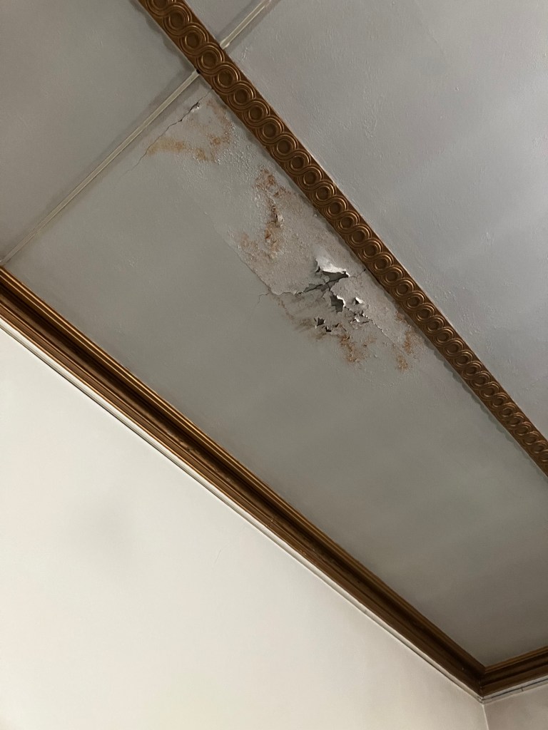 I know nothing of churches. There is a smaller room, with pews and an altar, off the main one. It needed a coat of paint, but what we were immediately drawn to was the multiple large cracks in the ceiling with water marks. There was something serious going on with the roof, beyond our abilities. As we left to go back to Dew Drop, I noted that that room is the only one with a flat roof. I wondered if it was buckling under the weight of snow in the winter, or if the rain was being trapped on it.
