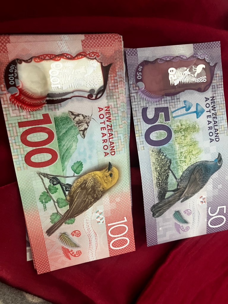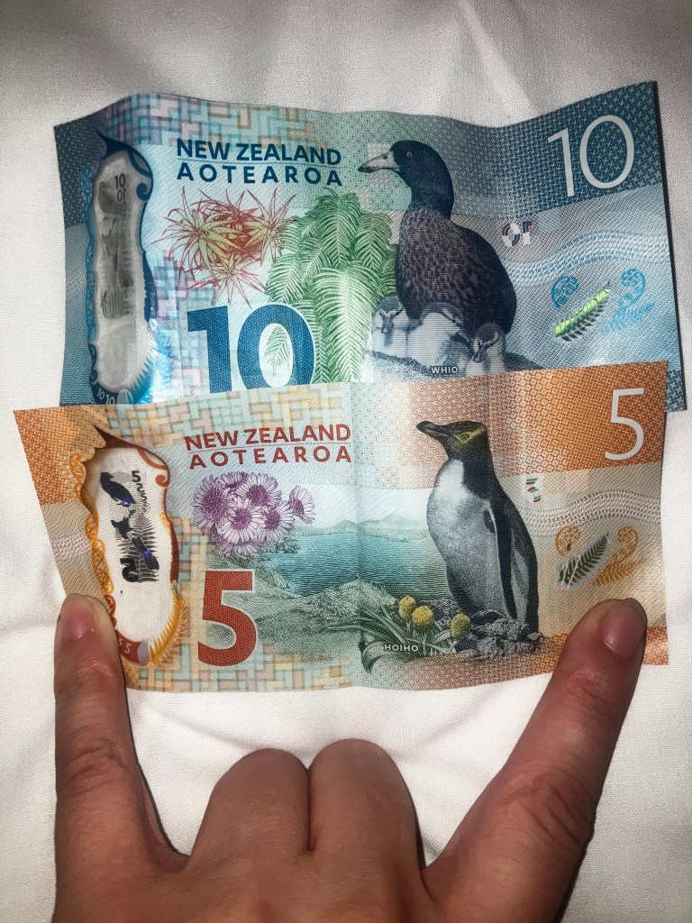 New Zealand money looks like ours, except covered in birds! Also they don’t have a 25 cent coin, they have a 50 cent coin.