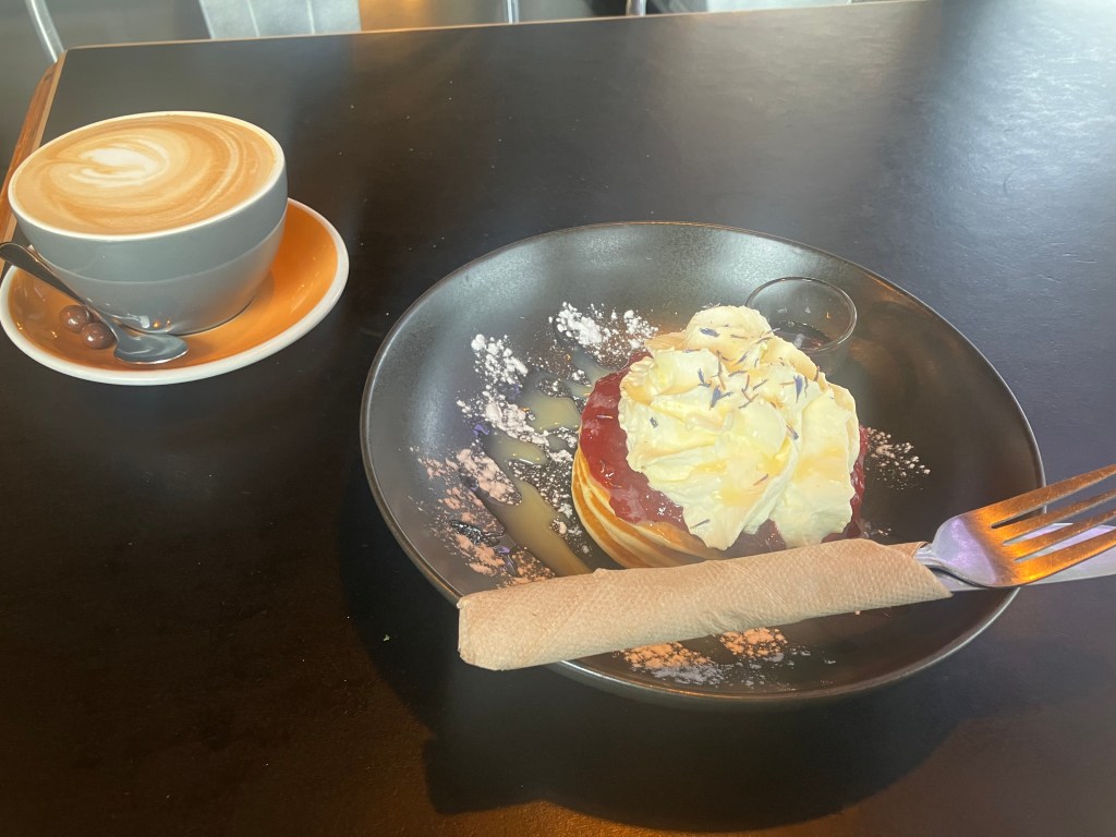 The website recommended a small coffee shop not even 100 meters away, so I walked there. Like England, you also order and pay at the counter, then seat yourself and they bring the food to you. I ordered a flat white and the pancakes, with rhubarb compote and maple syrup (really?).