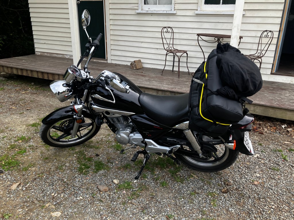 I had lunch at the centre and headed out around 1PM. A bit early, but I hadn’t planned for a whole lot today lest something go sideways. I tied the bags on differently this time. Gassed up before I left the city.