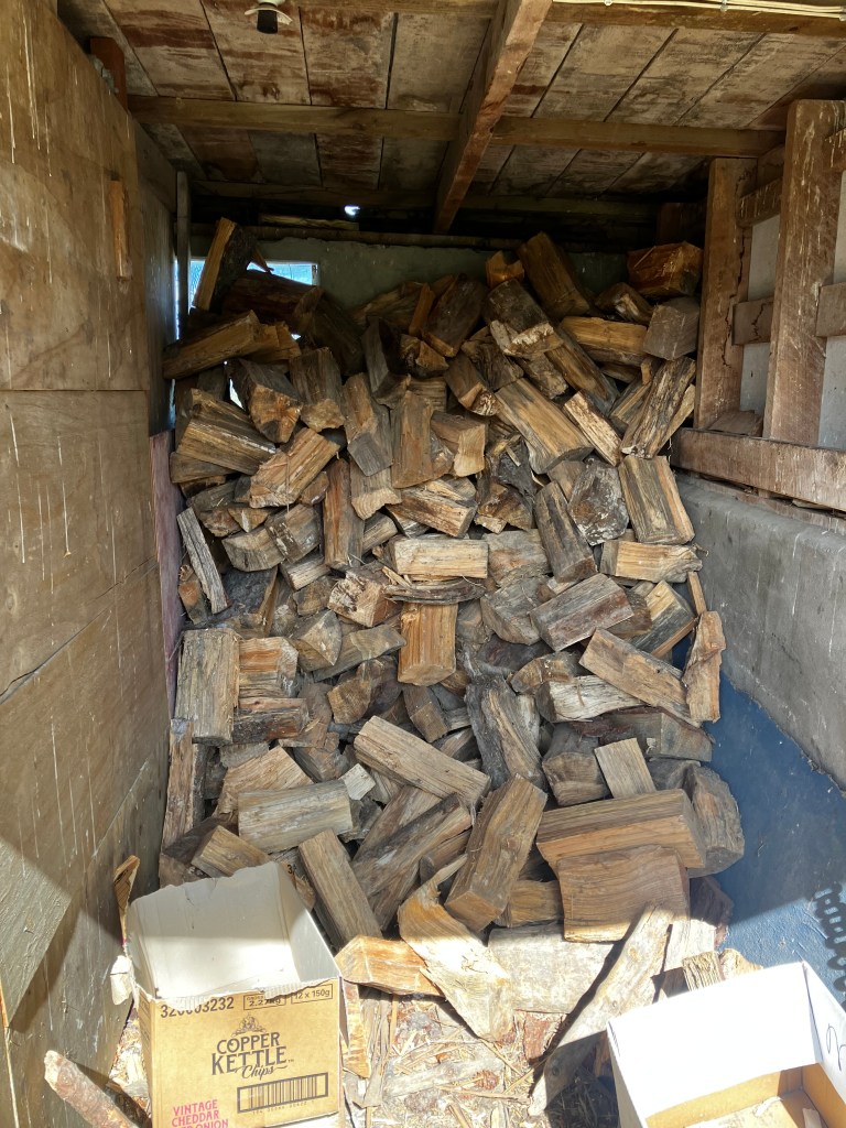 I grabbed the wheelbarrow and went to the woodshed. The wood was precariously stacked taller than me, and I thought about the irony of a carpenter dying in a firewood avalanche. “Here lies Lucy, 29, died of tree revenge“. I filled it with lots of woods. Some small pieces for tinder, medium pieces for building the fire up, and a couple of large pieces to burn while I was sleeping. That done, I flaked around the cabin a bit, trying to coax the wi-fi into behaving, before I hiked out to the road for better cell reception.