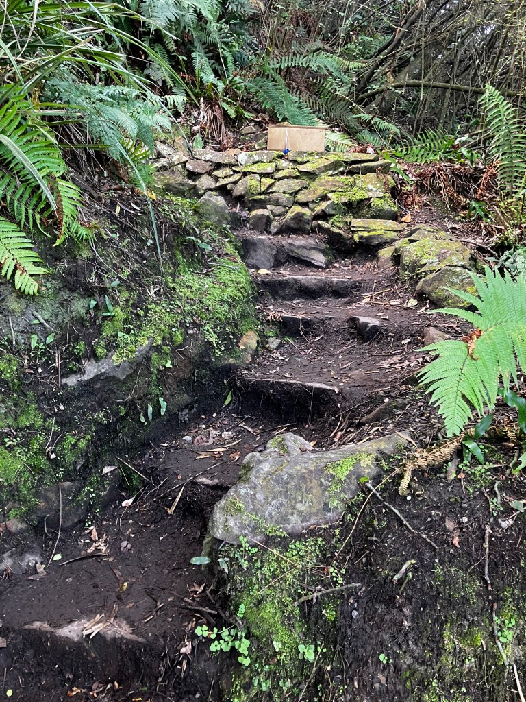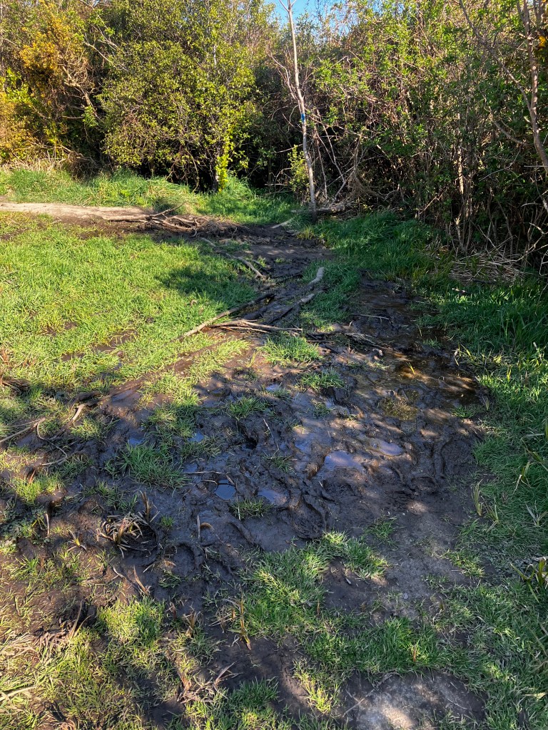 The next bit got more rough. There was even a part where the trail had washed out and you had to sidle around a tree to continue. There were parts of the trail with water running across them. At one point, I decided to try and step around a muddy section by stepping on the grass, which looked drier…. and wasn’t. It was like quicksand! I was sucked in over my ankles and my socks were soaked with mud.