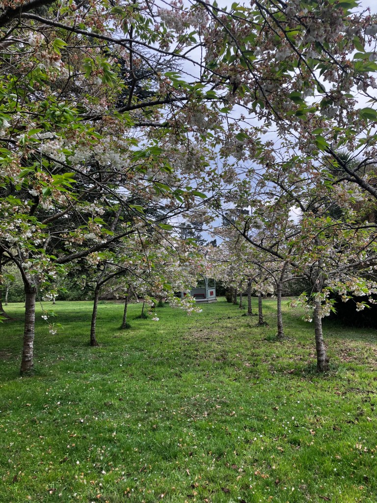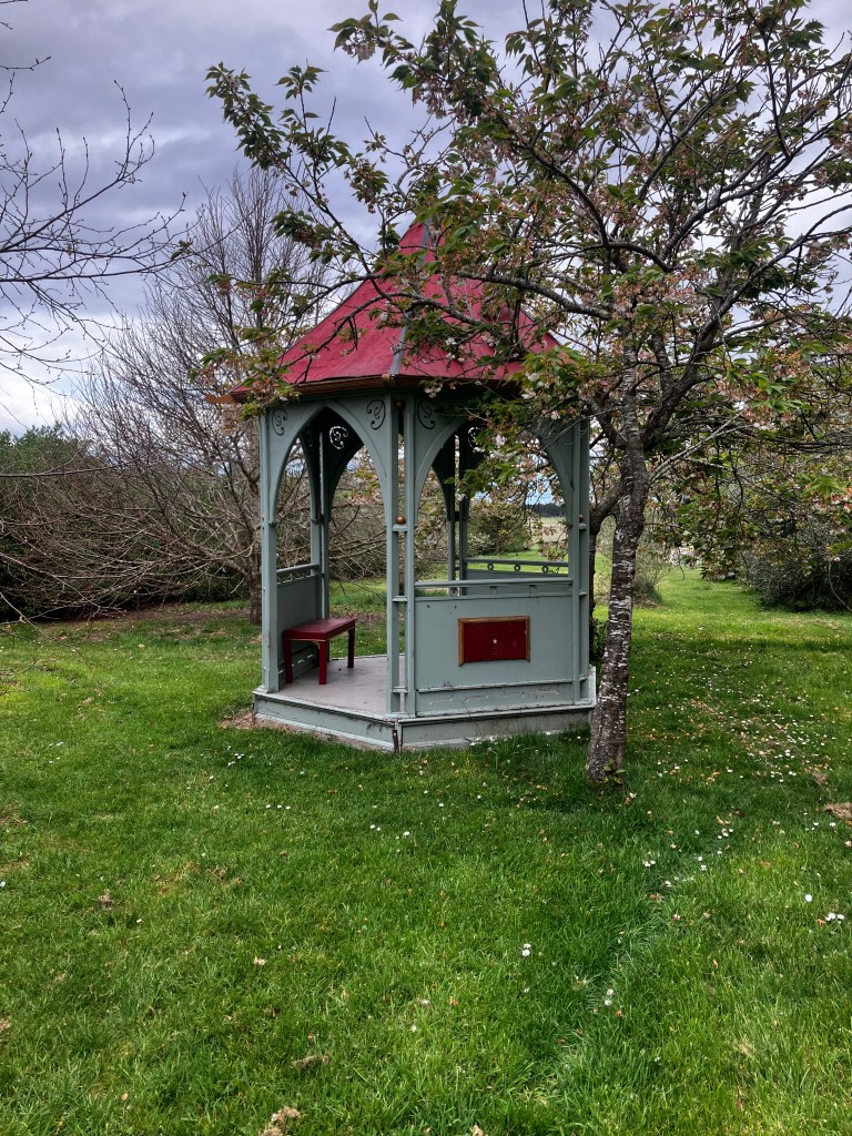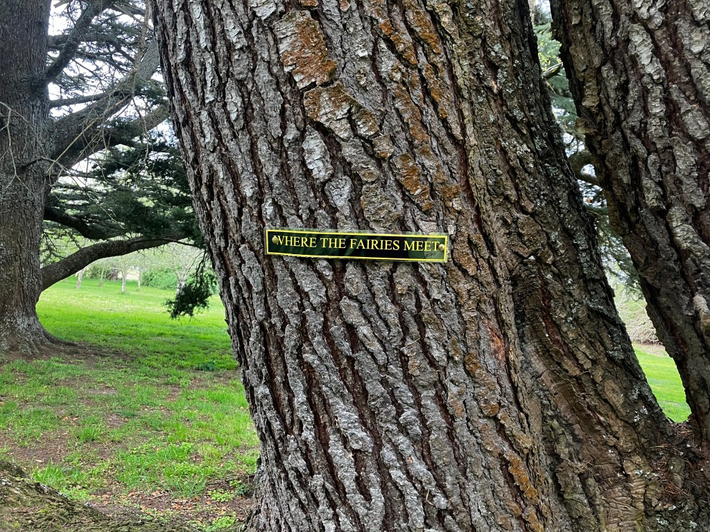 I hadn’t actually taken much of a wander around the property. I guess I just assumed it was fields of grass and trees at the property line. I was mistaken! There was a little fenced-in secret garden, a gazebo tucked down two rows of flowering apple trees, a pond, and a funny looking tree with 3 stone statues. Attached to the tree was a sign that said “where the fairies meet”.