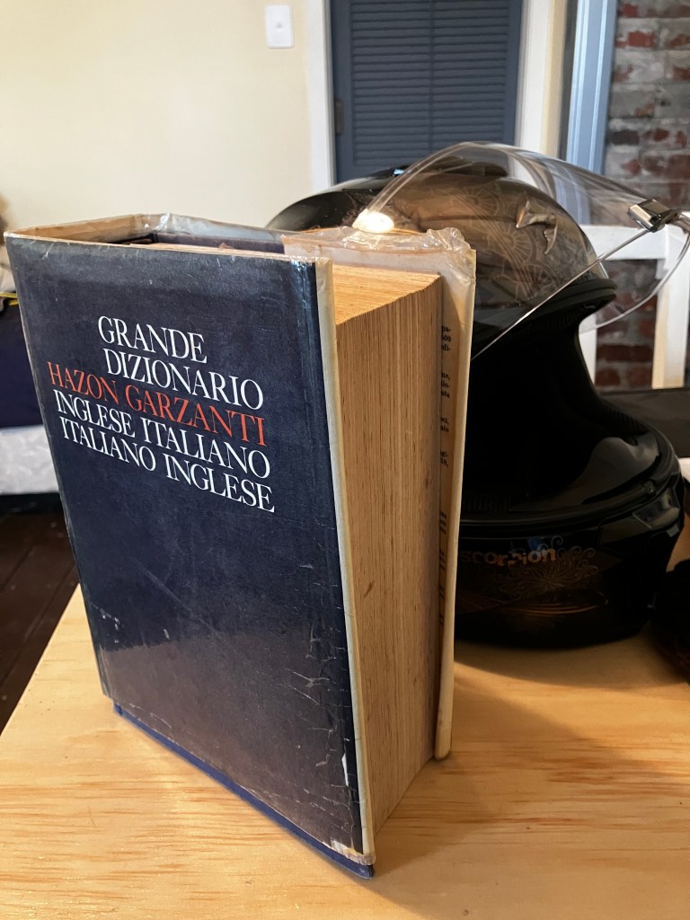 I immediately grabbed a kitchen chair and placed it as indicated, climbing up onto it. She has a high shelf stacked with language-to-language dictionaries. I was directed to grab the Italian-English one.