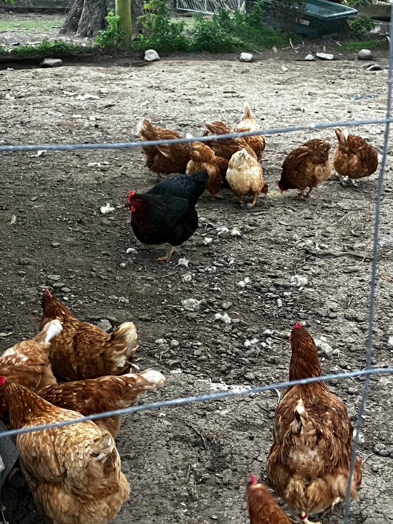 Righto. She has mostly brown hens, but there are two odd ones; a white one, quite a pretty bird, and a large black one that I mistook for the absent rooster at first. They had been part of a larger group that was gifted to her, mostly deceased now. Neither of them laid many eggs anymore, but she didn’t seem to be in a hurry to cull them.