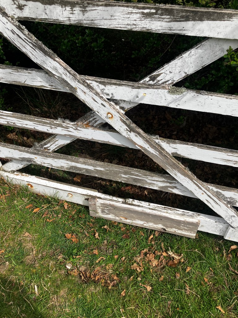 When I got to the gate and knelt down to take a look at it, I facepalmed. Someone had screwed a piece of wood to the gate where the broken bit was… without marrying the two pieces. Which is not only useless, but now I have to go get the impact gun to remove it!