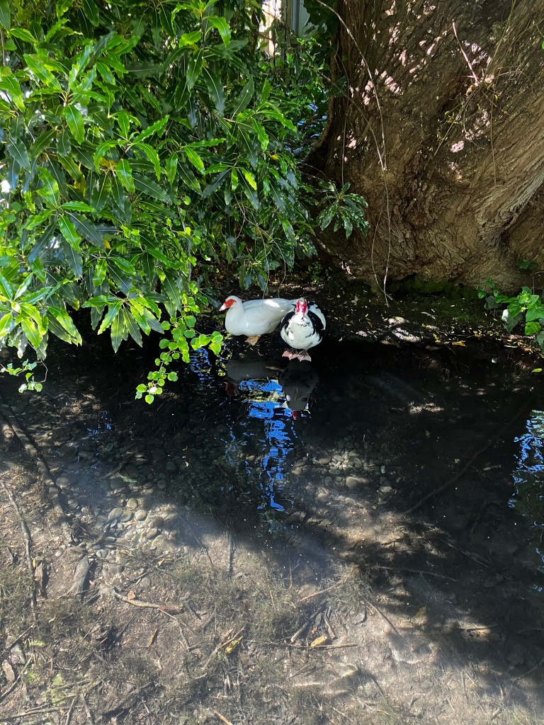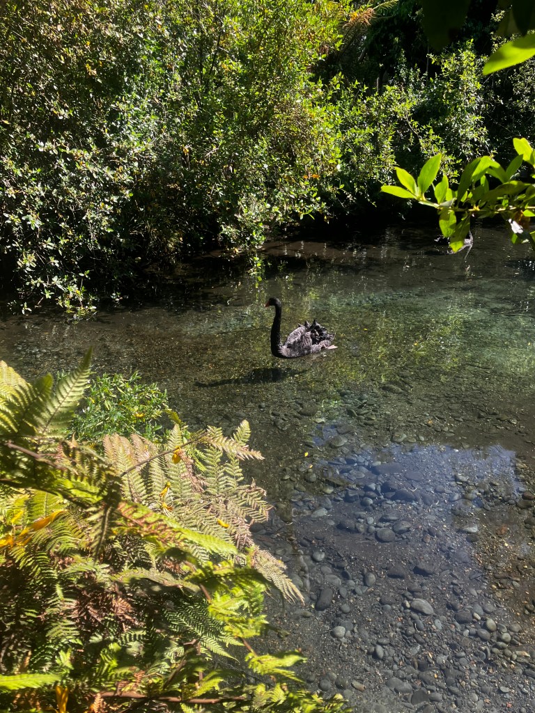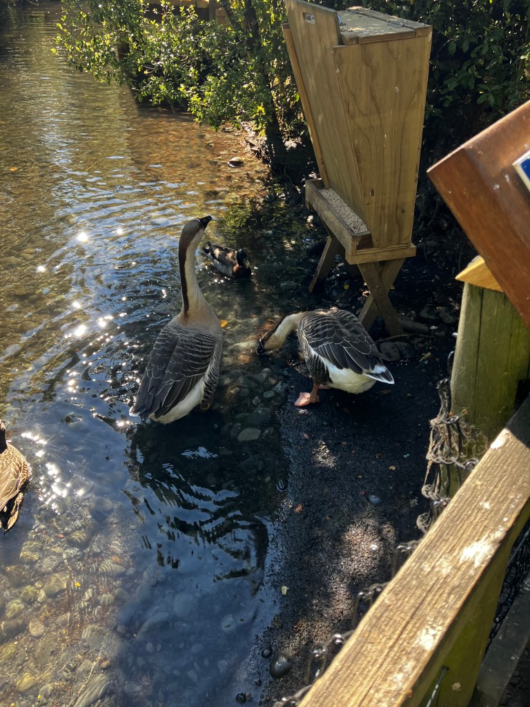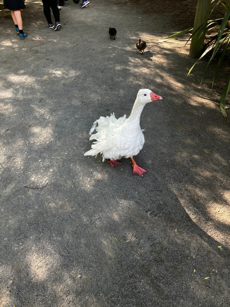 All along the waterway was a collection of fat, colourful New Zealand ducks and geese. There was a regular swan (because no collection of waterfowl is complete without one, it seems. There was also a literal odd goose: the so-called “curly feather goose”, or Sebastopol goose. They were bred for down pillows, and their messy feathers unfortunately means they can’t fly.